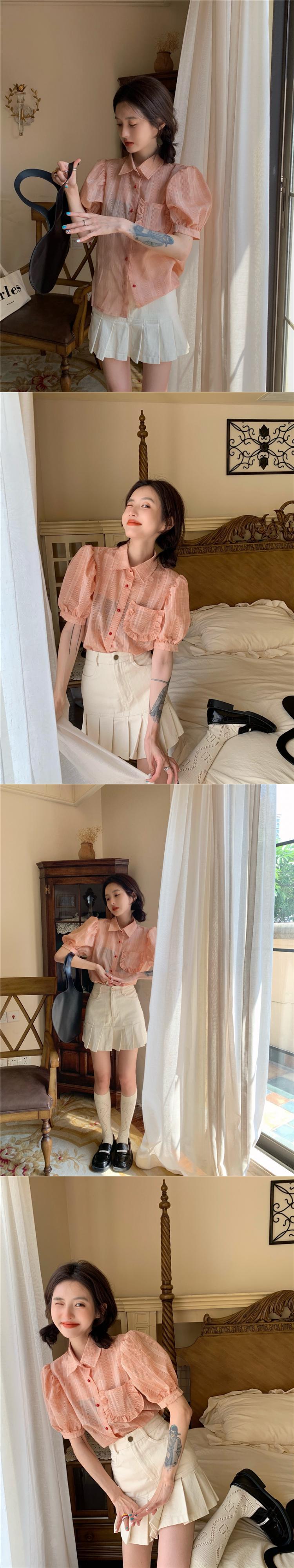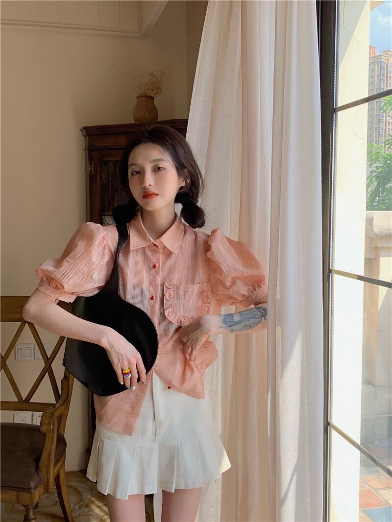 スタンダードスリーブ格子柄シャツ サマーショート半袖トップス レトロ ハーフスリーブ 夏物 ブラックストロベリース14943497937