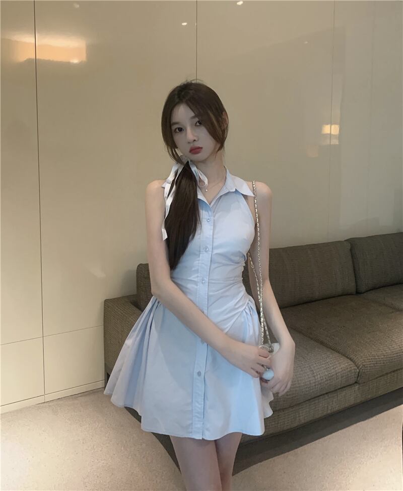 シャツ ドレス サマーショートスカート ウェストプリーツ 大人ガーリー スウィート キュート カジュアル 夏物 ブラックストロベリース71832769111