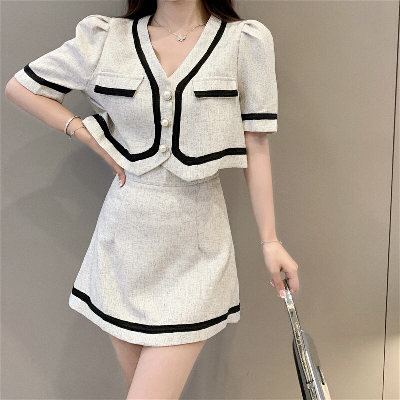 レディースショートジャケット ハイウェストウェストスカート サマー ストリート 夏物 ブラックストロベリース49177895449