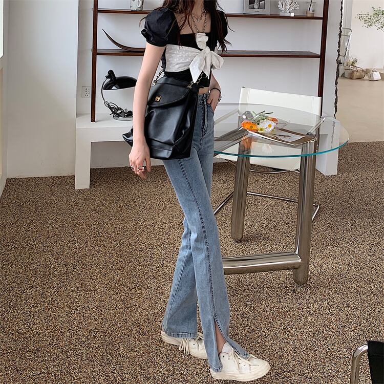 ジーンズ サマー薄手スタイルハイウェストウェストワイドレッグパンツ レッド 夏物 ワイドパンツ ブラックストロベリース12589838411