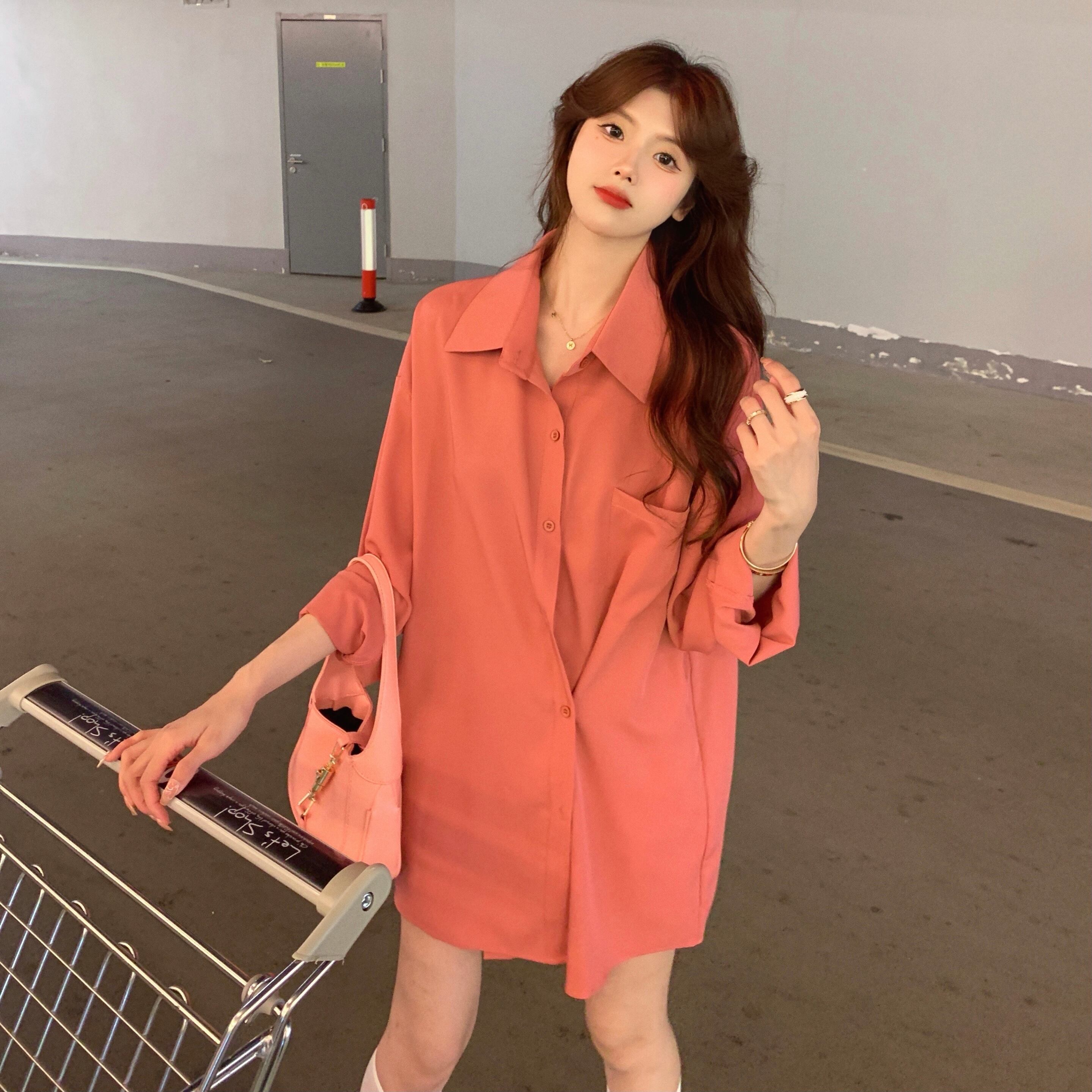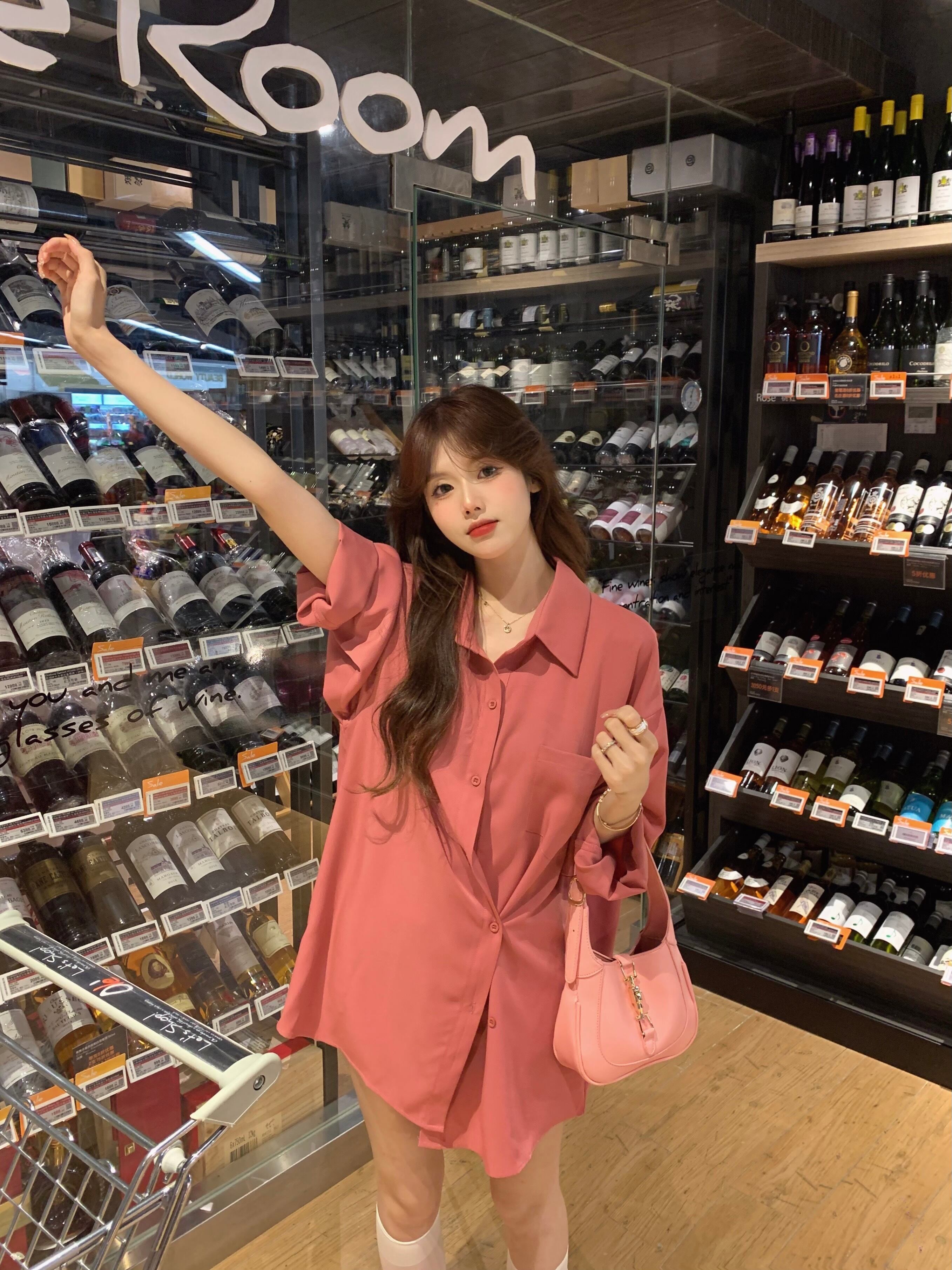 ブラウス ルーズシャツ ジャケット サマー薄手スタンダードスタイル ロング ピンク レトロ 夏物 ブラックストロベリース10139741589