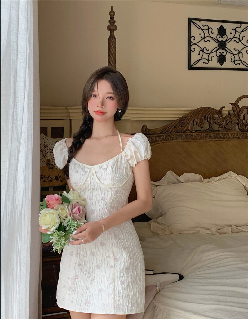 フローラルドレス ホワイトウェスト薄手ショートスカート サマー 夏物 花柄 ブラックストロベリース39240256831