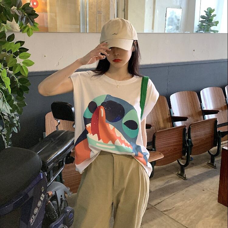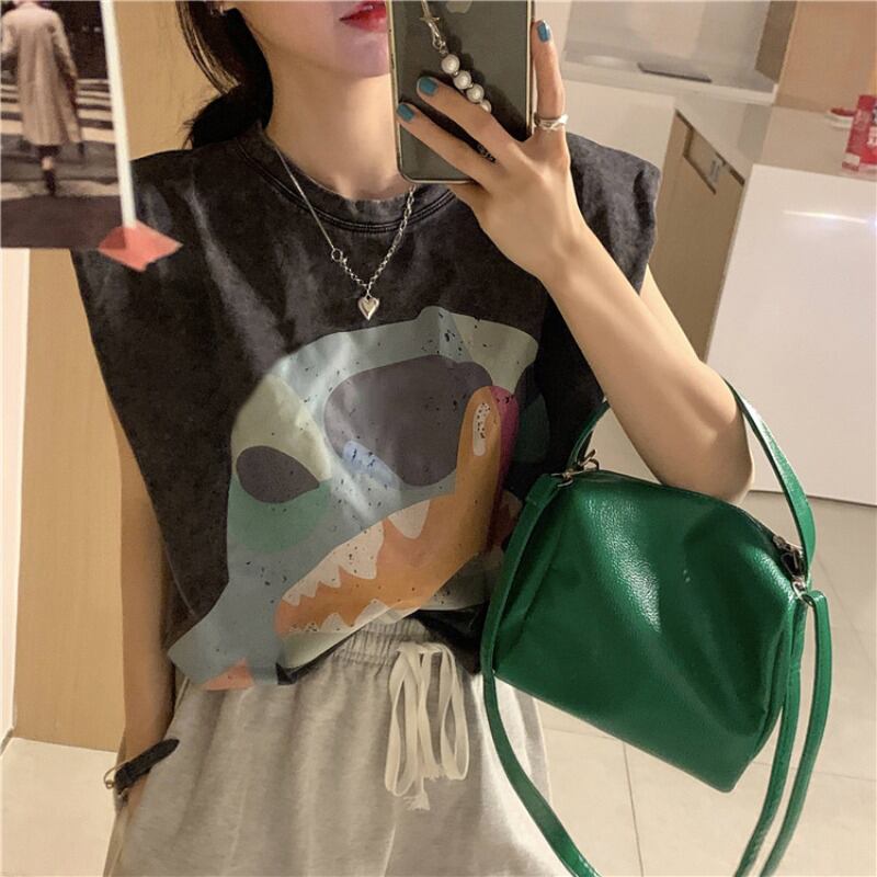 Tシャツ ルーズプリント柄ブラックノースリーブサマースタイル薄手トップス 夏物 ブラックストロベリース625338841