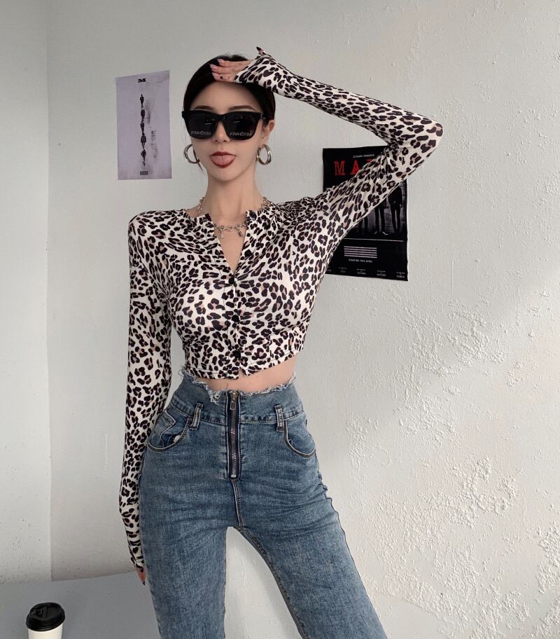 レオパードプリント柄シャツ ショートクロップドトップス スプリングTシャツ ロング 春物 ブラックストロベリース61160661276
