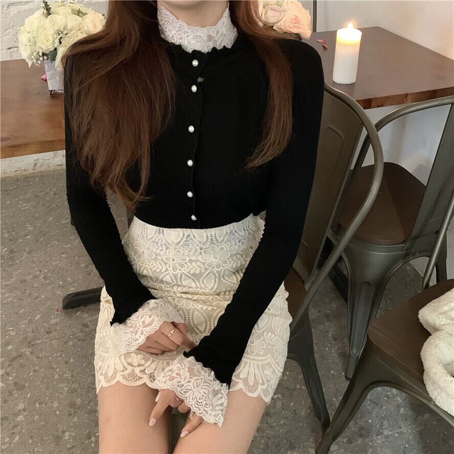 ニットカーディガンショートコート レーススリムセーター スプリングトップス ロング 春物 ブラックストロベリース42735724618