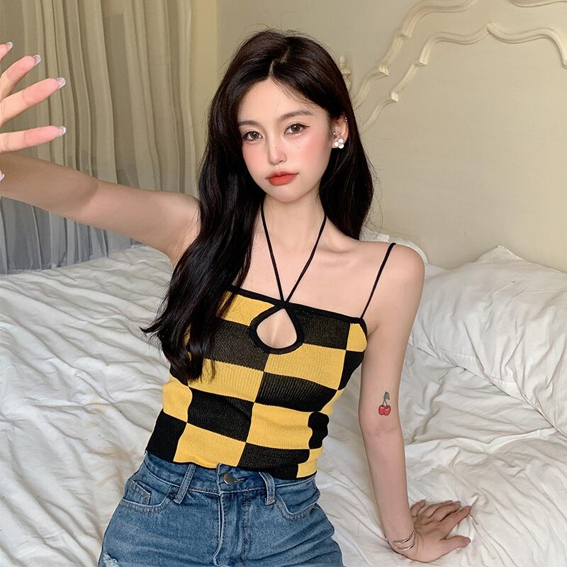 格子柄サマーショートホルタートップス 夏物 ブラックストロベリース84168464053
