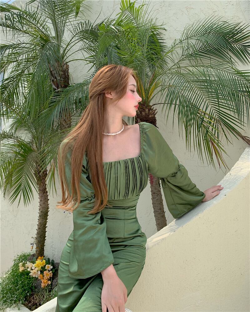 ブラックダークグリーンハイウェストウェストスリーブスカート スクウェア ブラックストロベリース37386542703