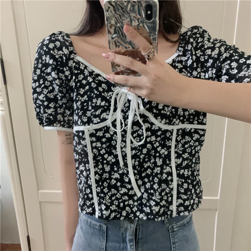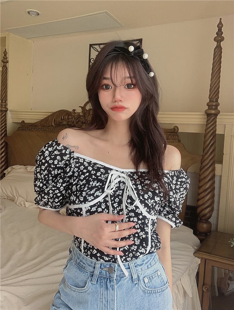 シフォンフローラルシャツ サマーショートブラックトップス 大人ガーリー スウィート キュート カジュアル 夏物 花柄 ブラックストロベリース78306979888