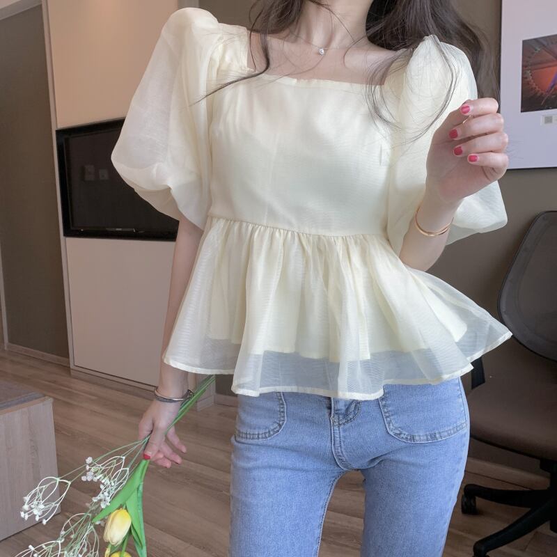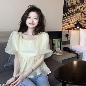 シフォンシャツ レディーススリーブショートメッシュサマーリボントップス 夏物 スクウェア ブラックストロベリース76126057257