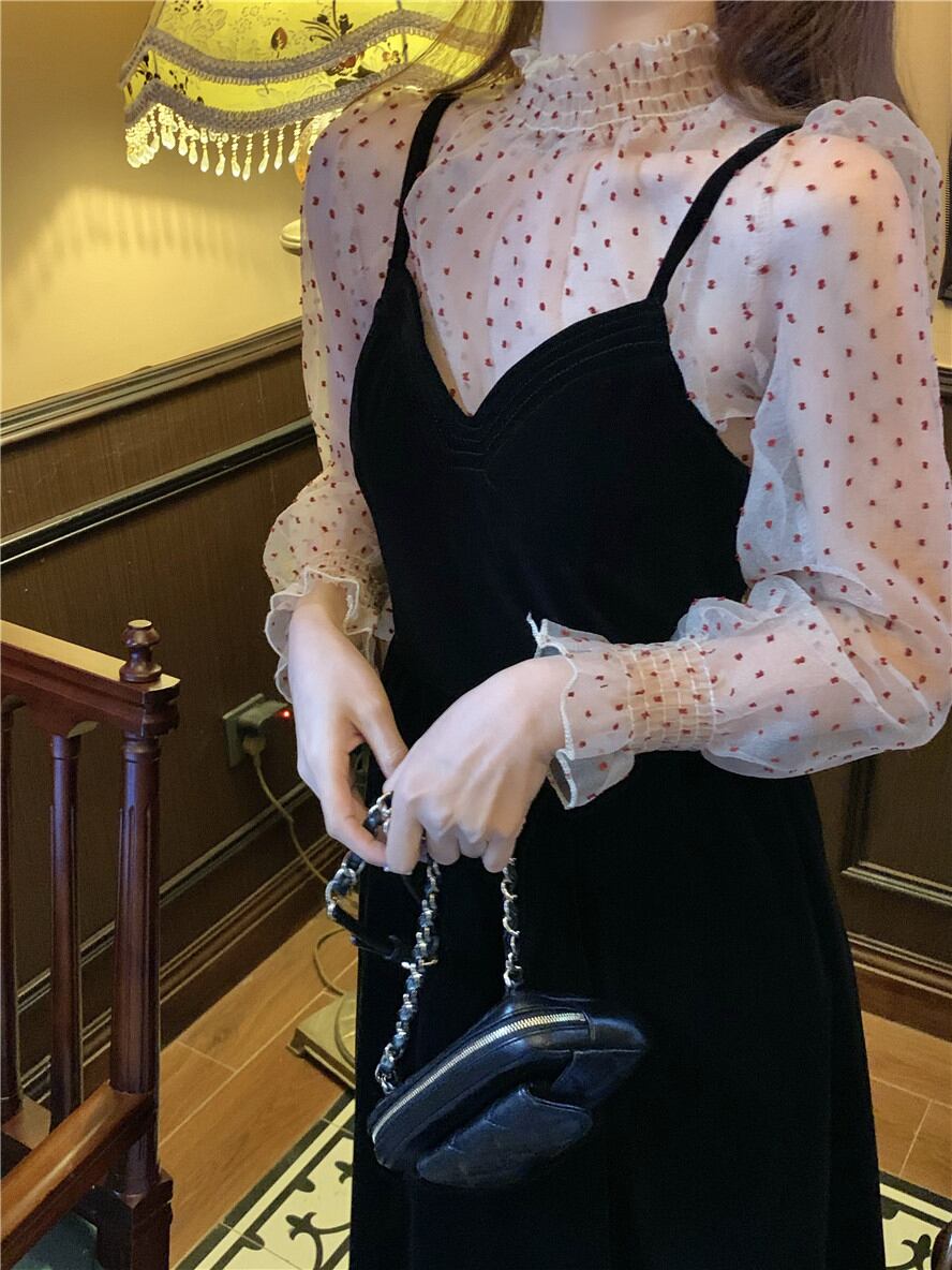 ドレス ブラックベルベットスカート スプリングスリムウェスト 春物 ブラックストロベリース90728114596