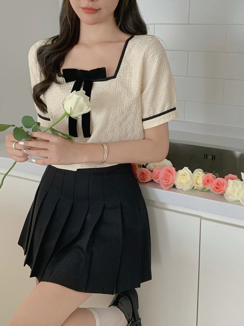 Tシャツ リボンカラー薄手ショートルーズトップス サマースタイル 夏物 スクウェア ブラックストロベリース15706064179