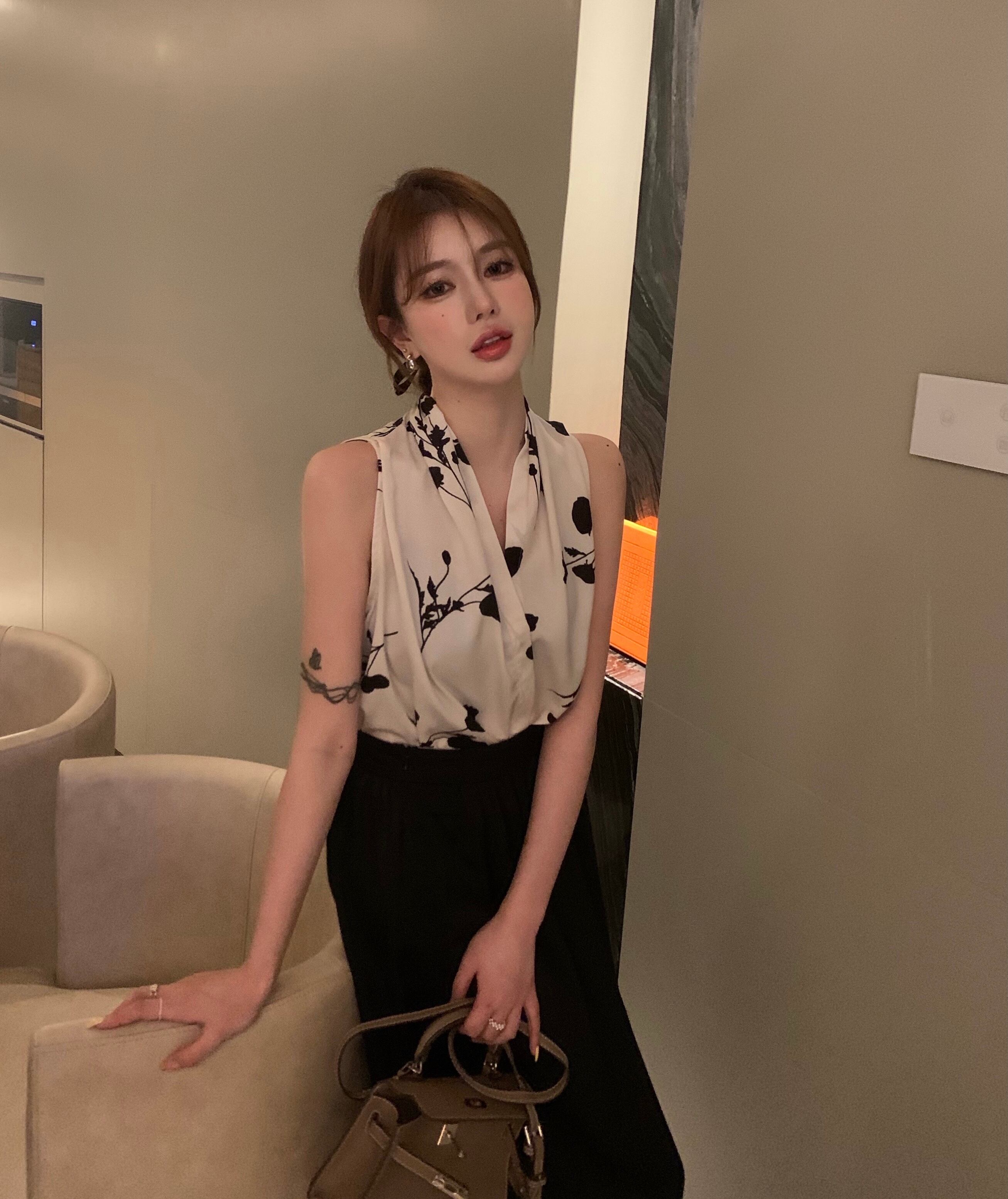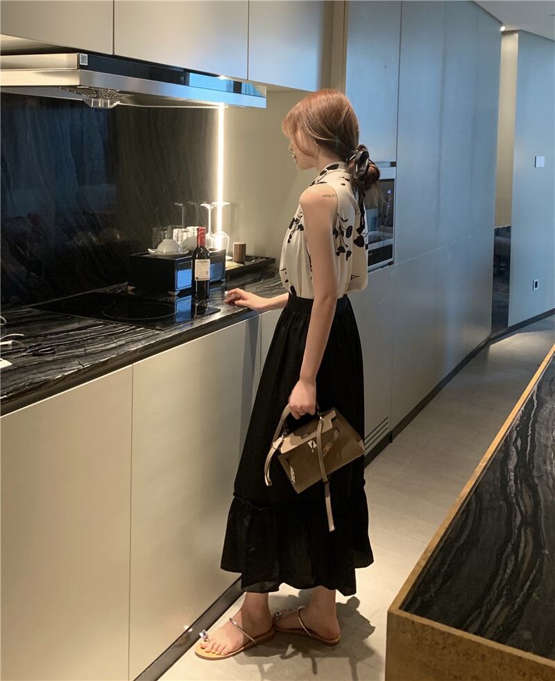 色:プリントベスト,黒スカート