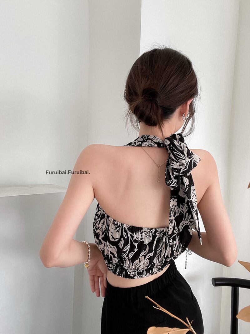 フローラルサマーショートホルタートップス 夏物 花柄 ピュア ブラックストロベリース21205428493