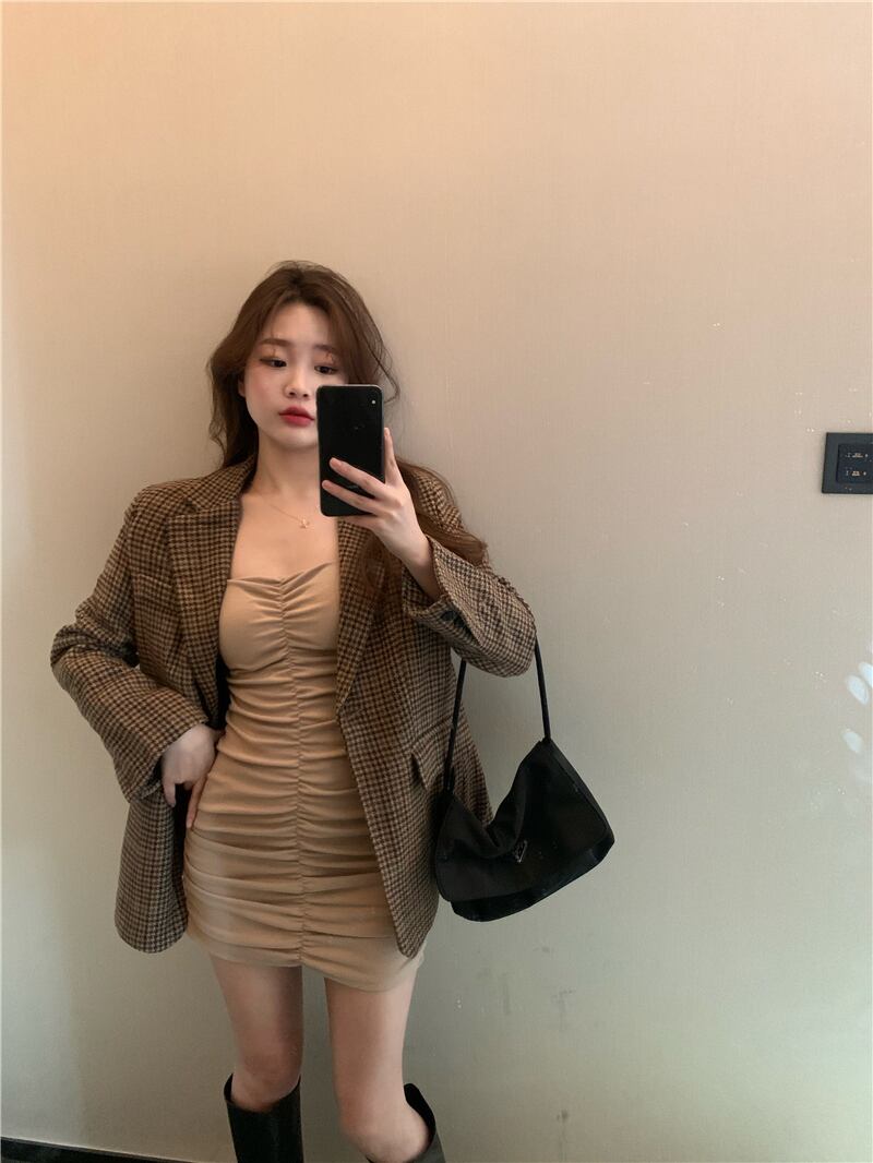 色:チェック柄ジャケット,アプリコットチューブトップスカート