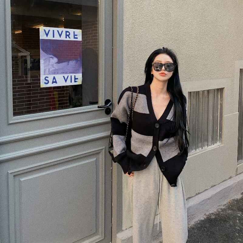 ニット Vネックルーズストライプセーター ジャケット スプリング薄手カーディガン 春物 ブラックストロベリース64254088943