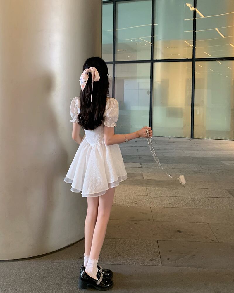 ドレス カラースリーブホワイト半袖スカート サマー ショート ハーフスリーブ 夏物 スクウェア ブラックストロベリース87715784748