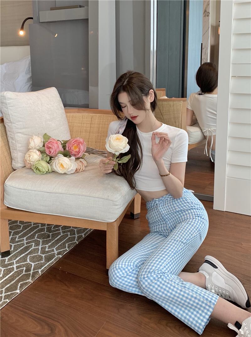 色:ネクタイ付きTシャツ,チェック柄カジュアルパンツ