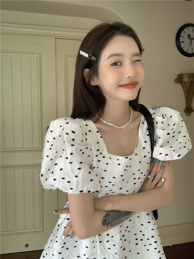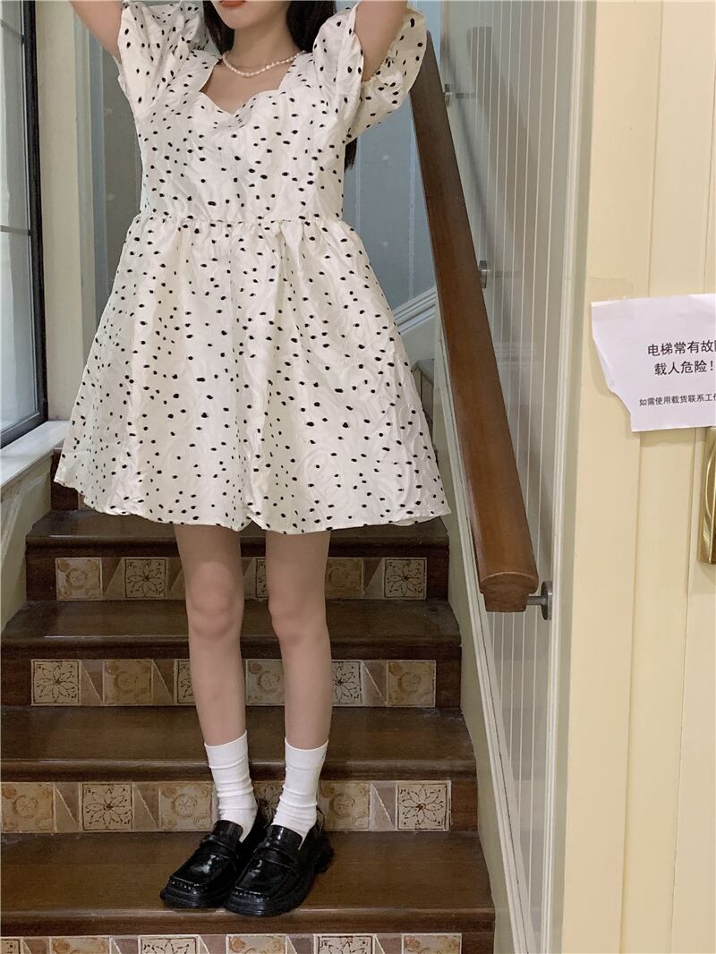 スリーブ水玉ドレス サマーショートスカート ウェスト 大人ガーリー スウィート キュート カジュアル 夏物 ブラックストロベリース19796257165