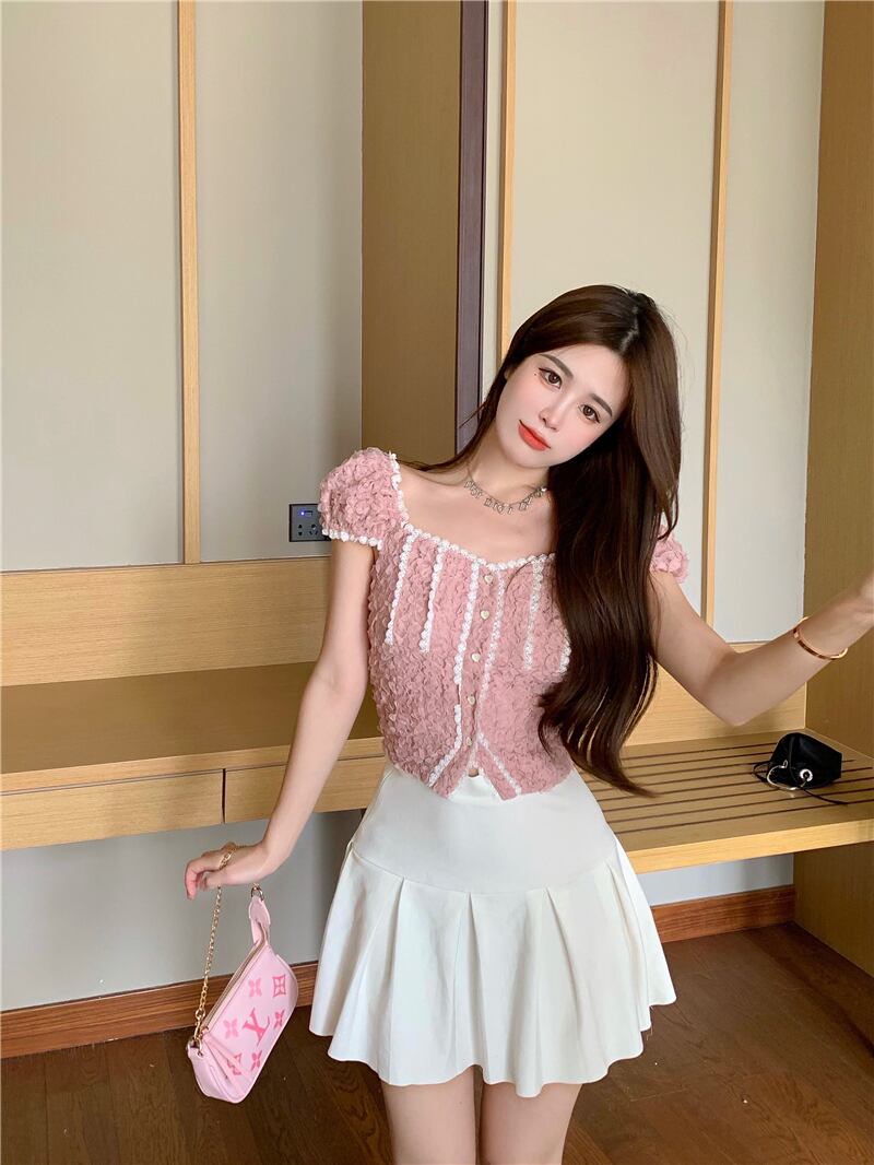レースシフォンシャツ サマーショート ピンク 大人ガーリー スウィート キュート カジュアル 夏物 ブラックストロベリース97246925154