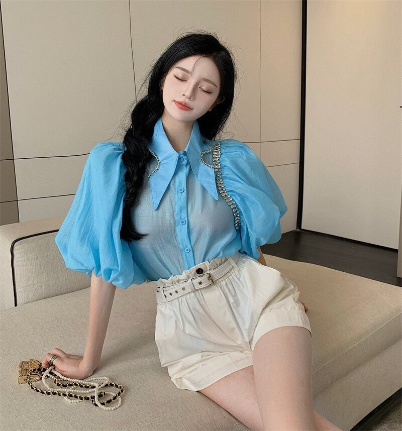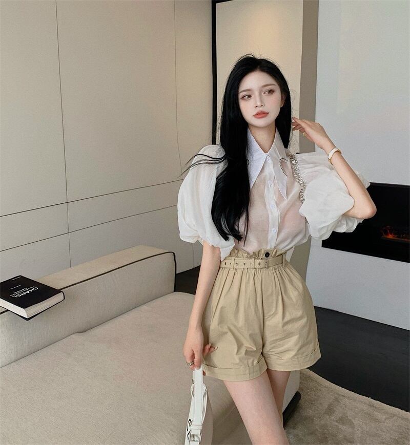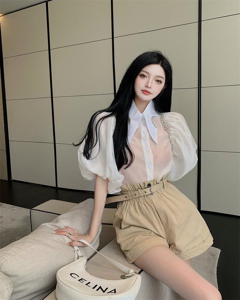 色:青いシャツ,白のシャツ,ホワイトショーツ,カーキショートパンツ