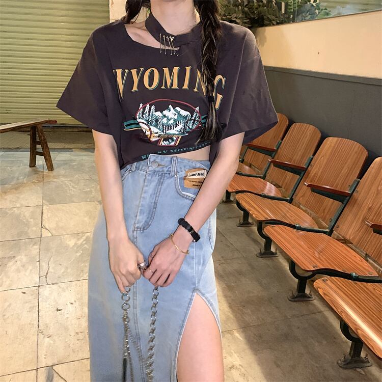 スタンダードプリントTシャツ サマーショートルーズカジュアルトップス レトロ 夏物 ヨーロピアン ブラックストロベリース69907036706