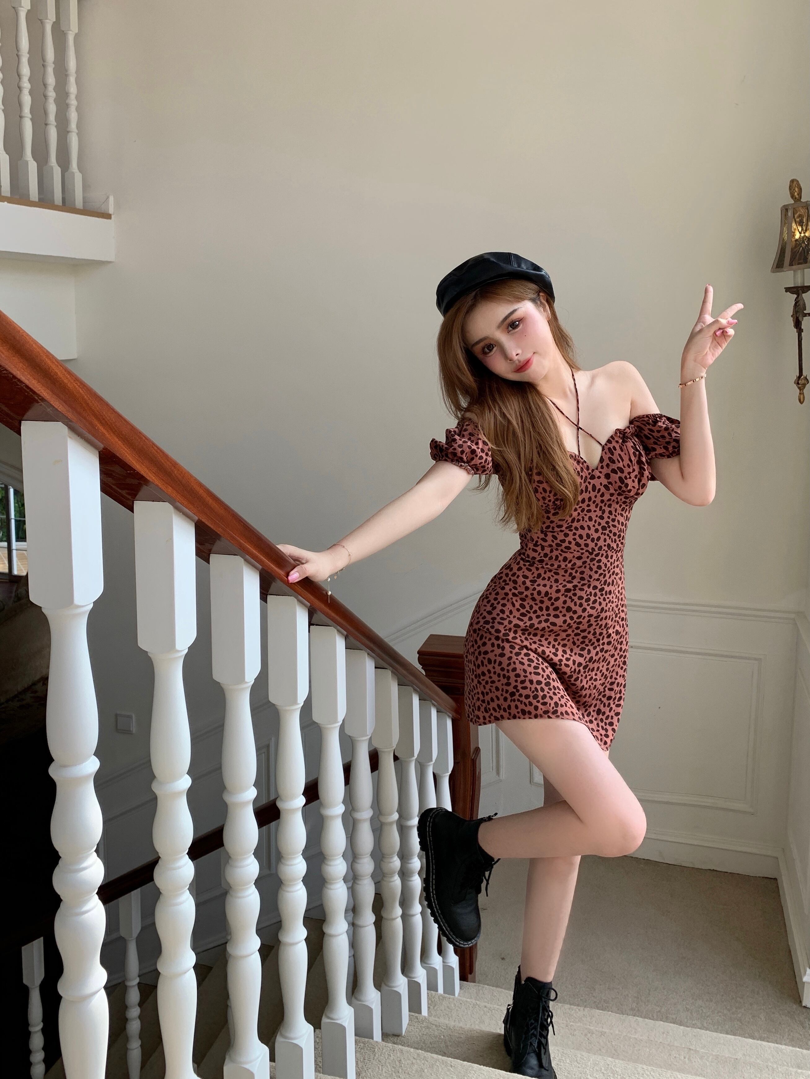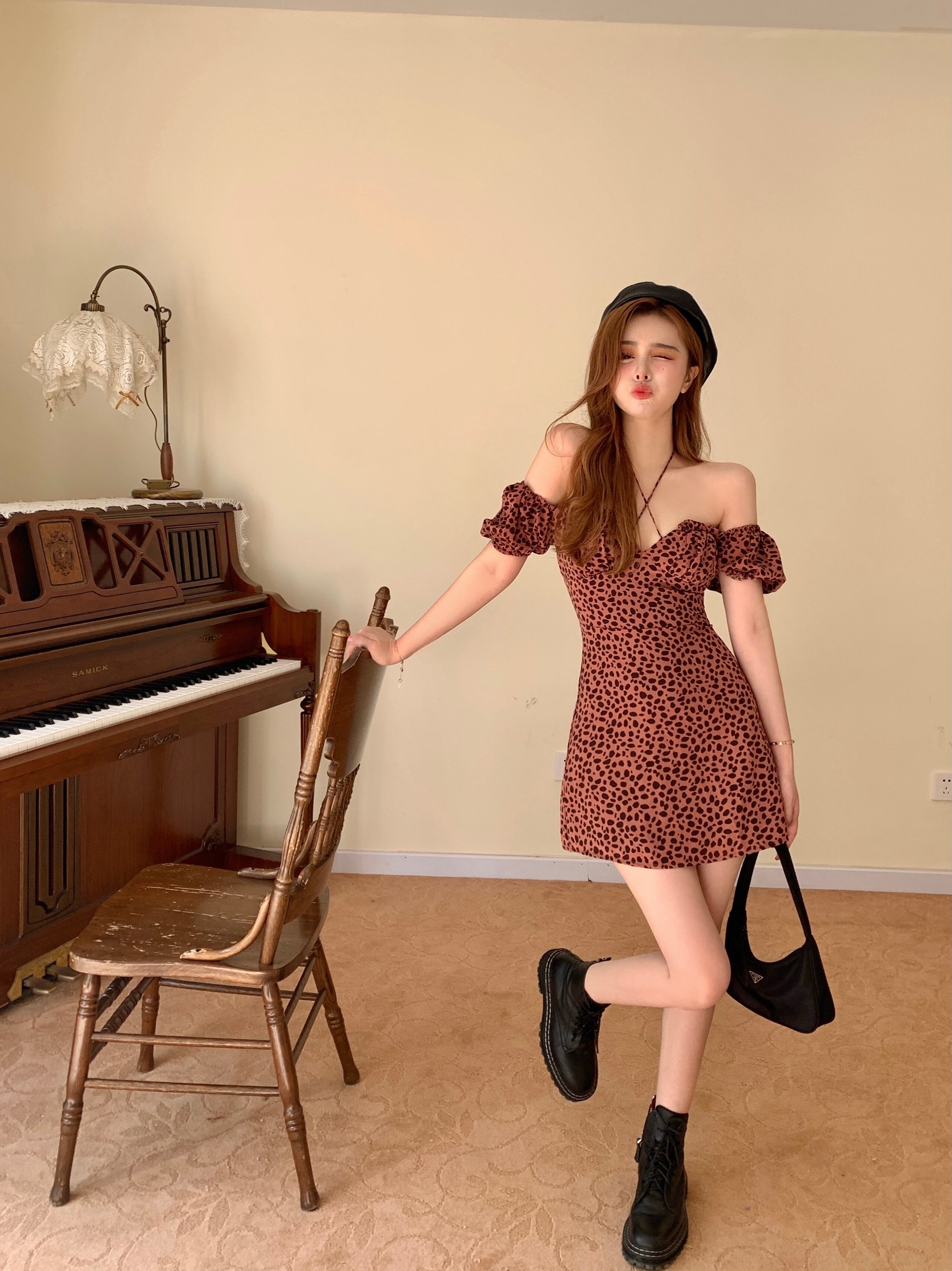レオパードプリント柄ホルタードレス サマーショートスカート ウェスト 夏物 ヨーロピアン ブラックストロベリース35398398801