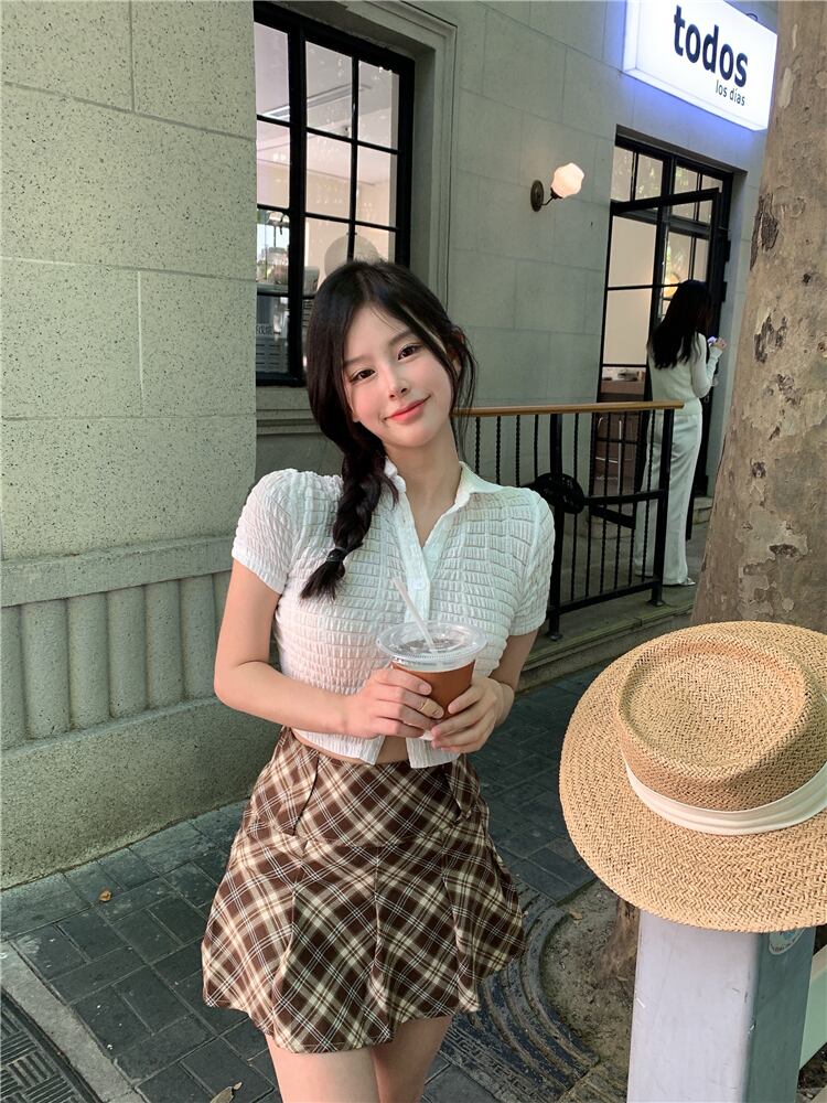ホワイトプリーツシャツ レディースサマー薄手ショートスリム 夏物 ブラックストロベリース27671478159