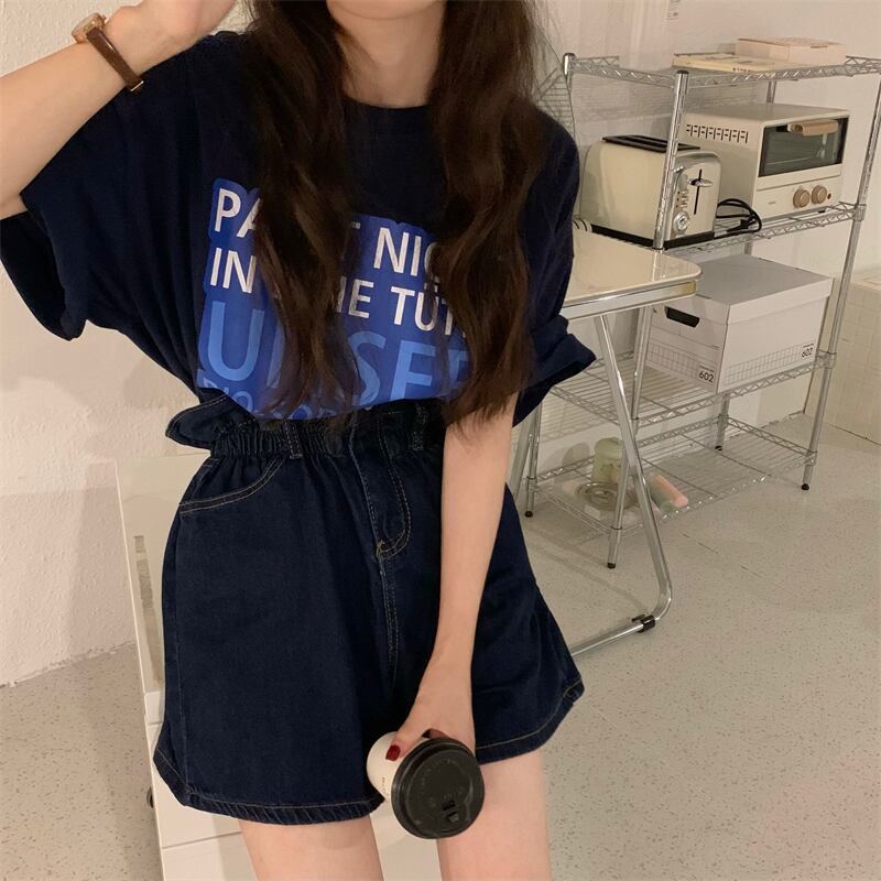 色:ネイビー半袖Tシャツ,ダークブルーデニムショーツ