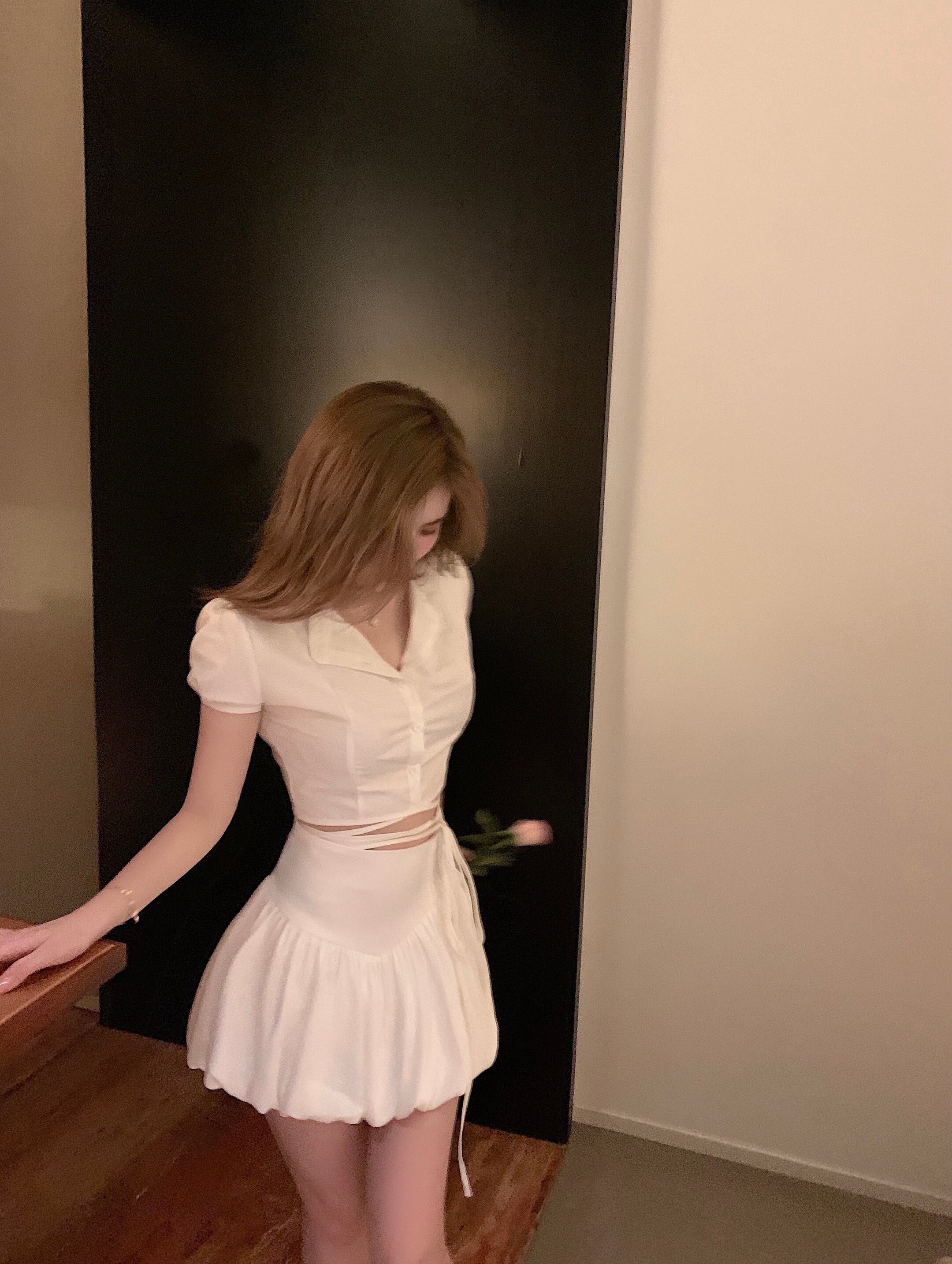 シャツ サマー薄手ショートホワイトハイウェストウェストトップス 夏物 ブラックストロベリース52255034078