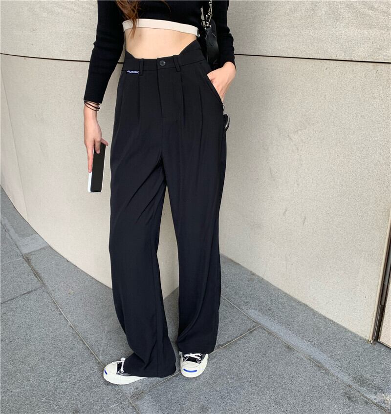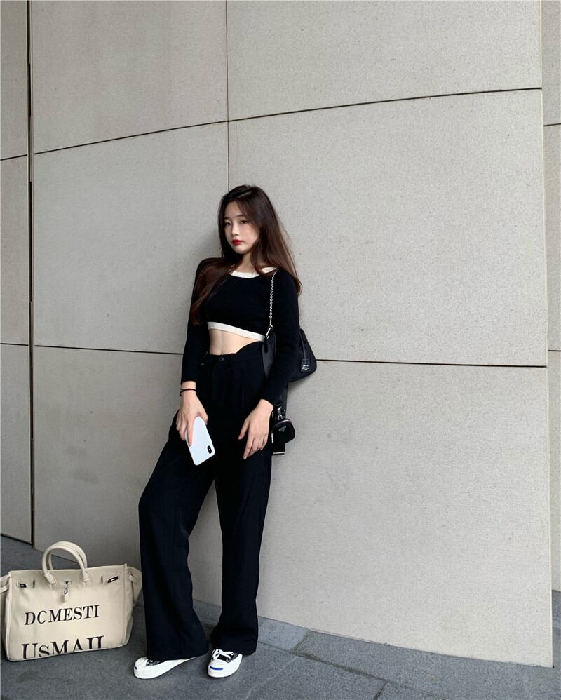 ルーズハイウェストウェスト薄手ブラックパンツ スプリングオータム 春物 秋物 ブラックストロベリース39463742848