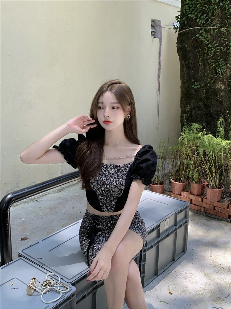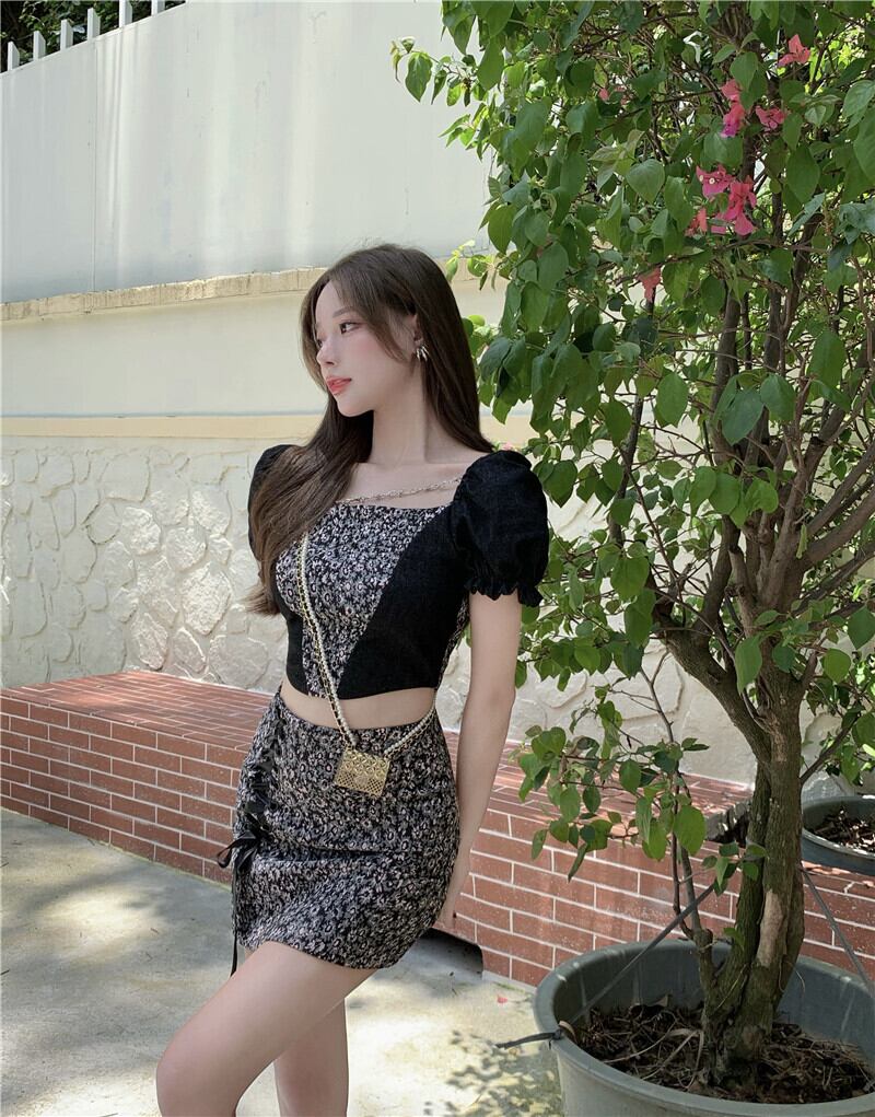 スタンダードフローラルスリーブTシャツ サマーショートスリム半袖トップス レトロ ハーフスリーブ 夏物 花柄 スクウェア ブラックストロベリース14701759646