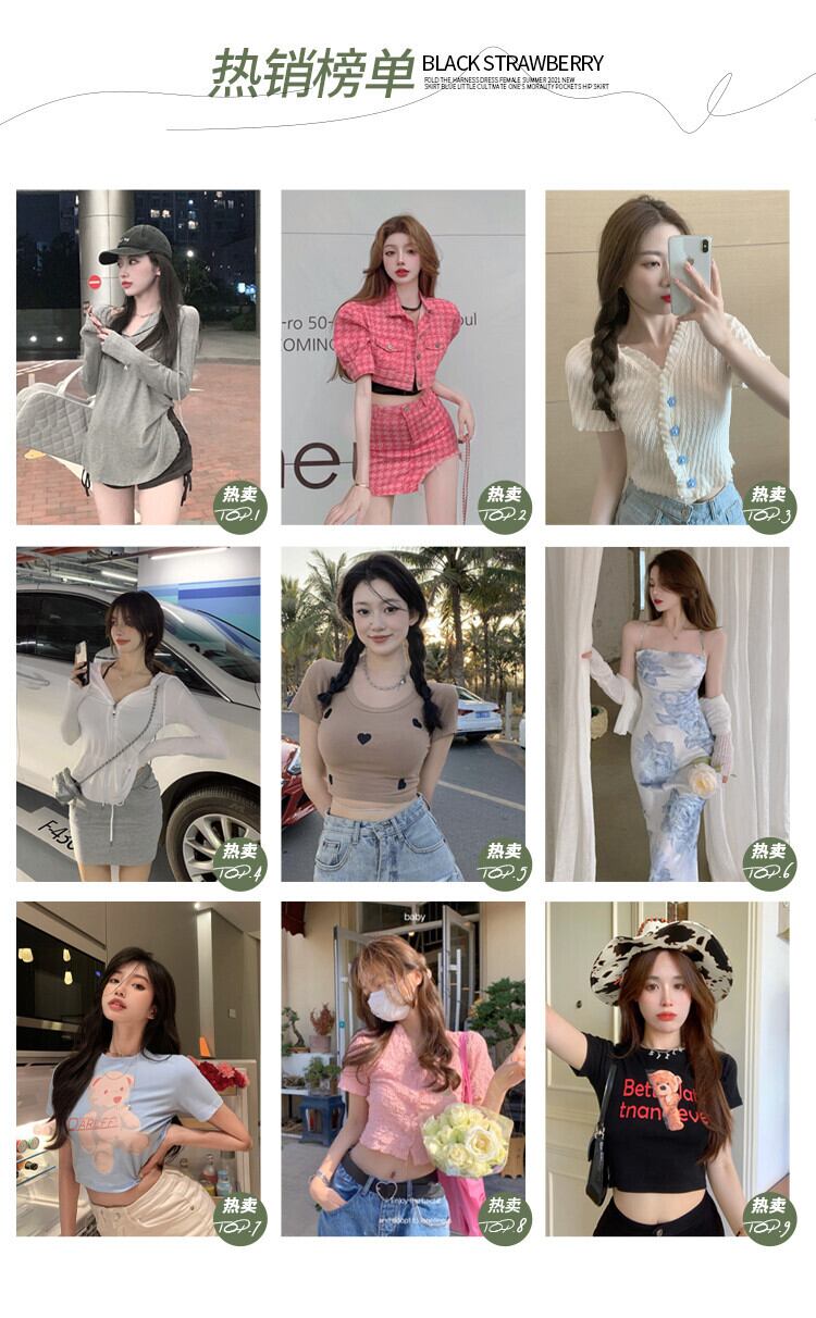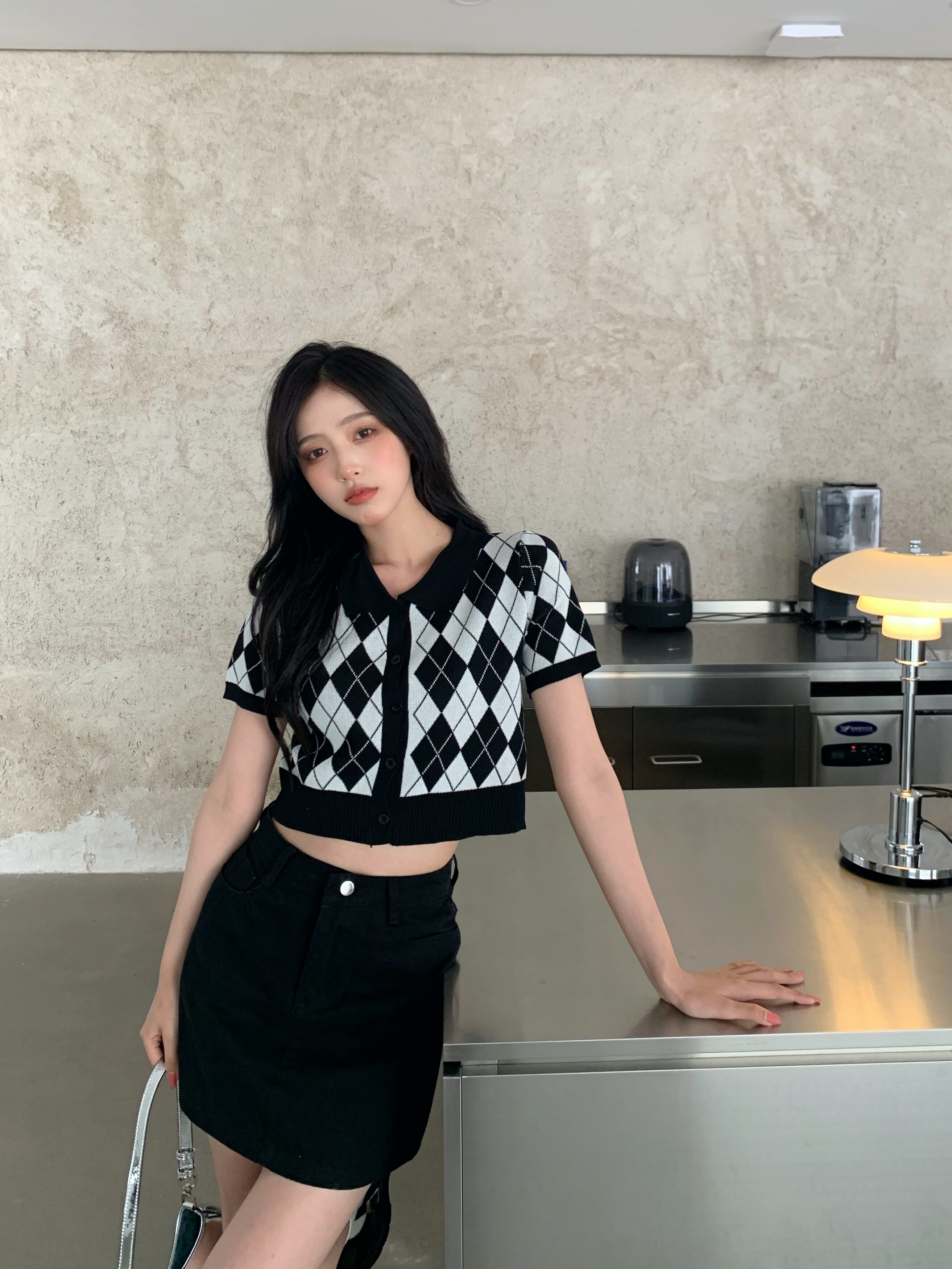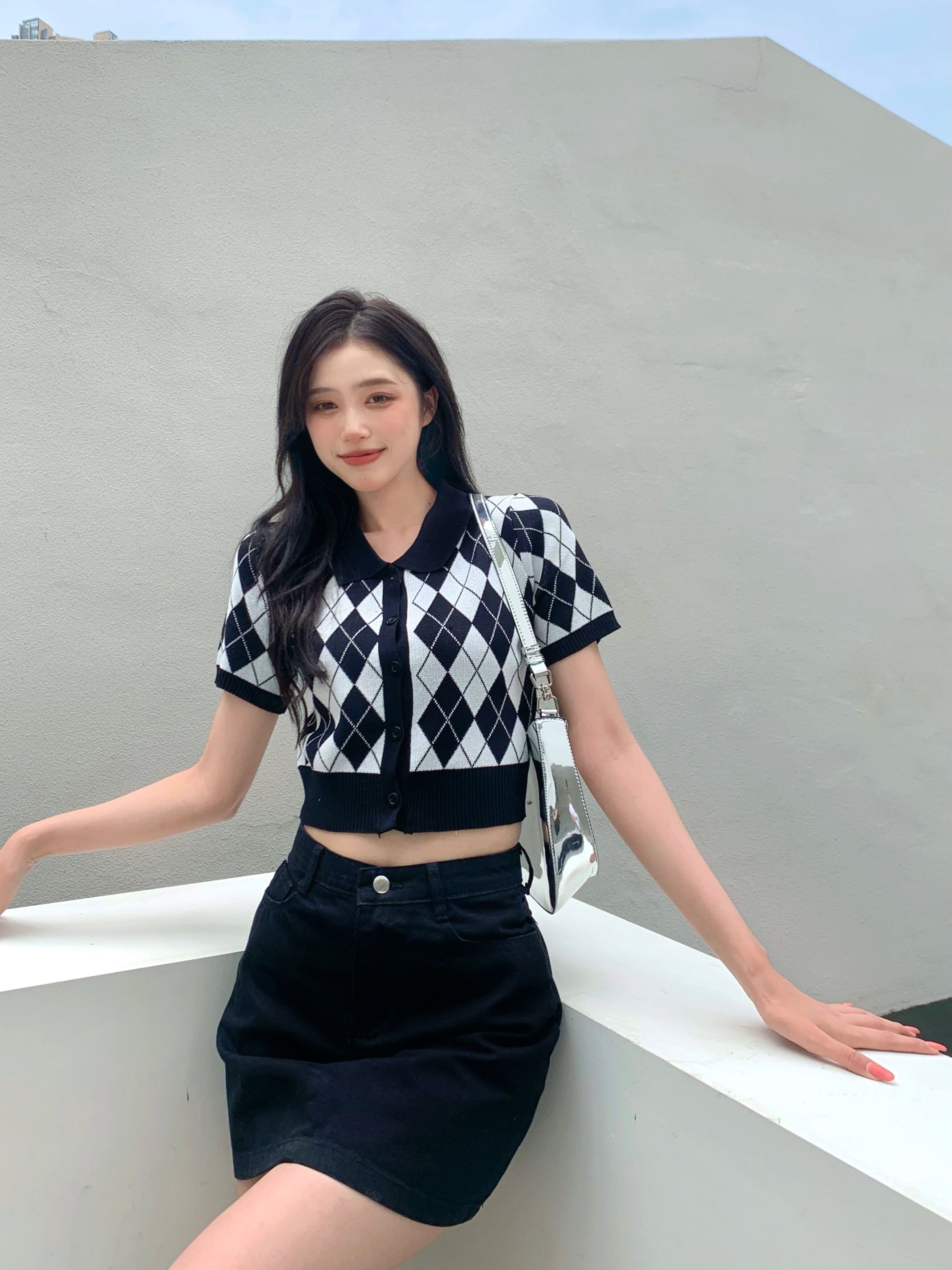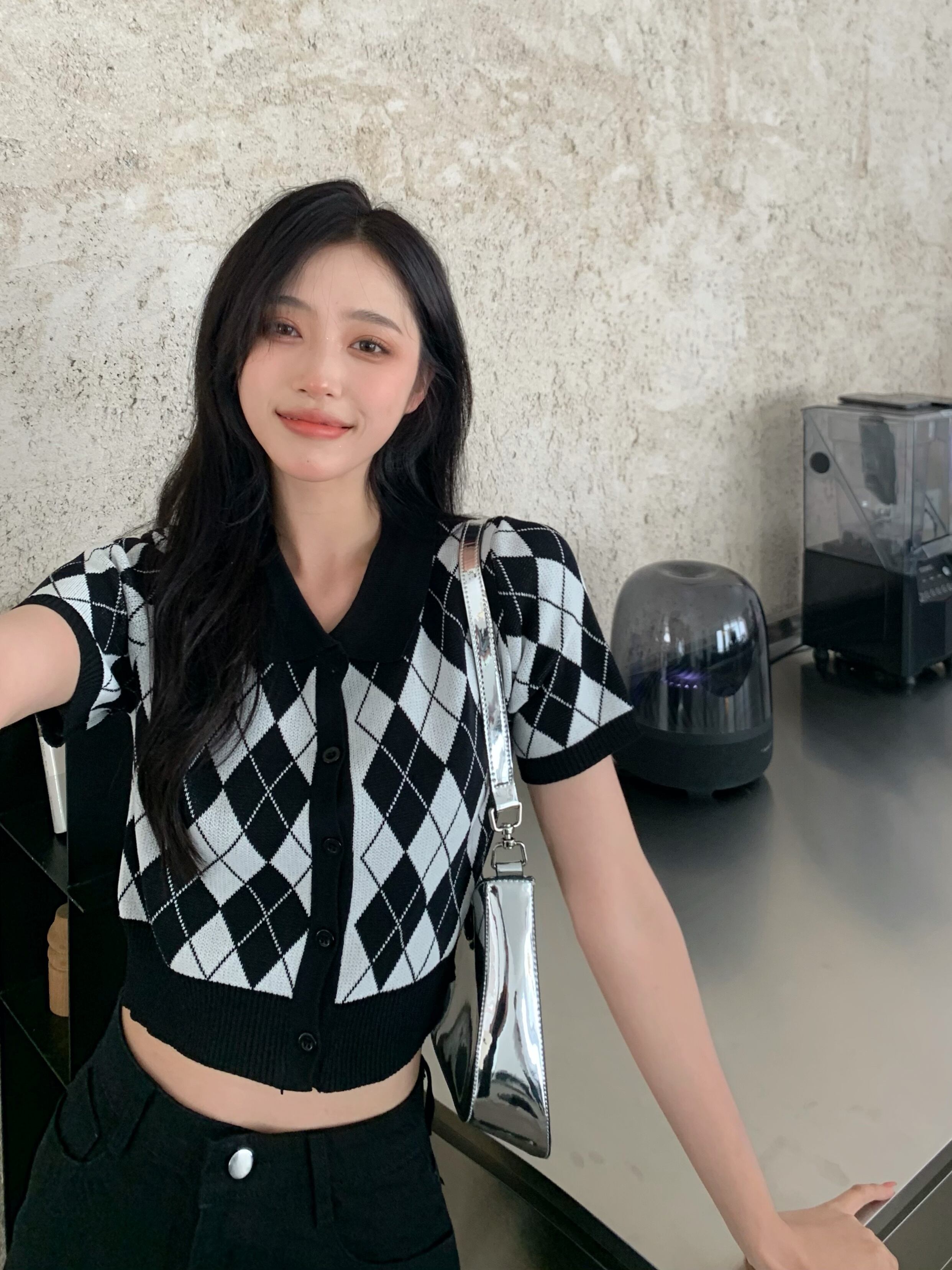 スタンダードカラー格子柄ニットカーディガンサマー薄手ショートジャケット トップス レトロ 夏物 ブラックストロベリース55992217182