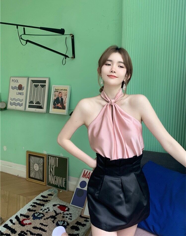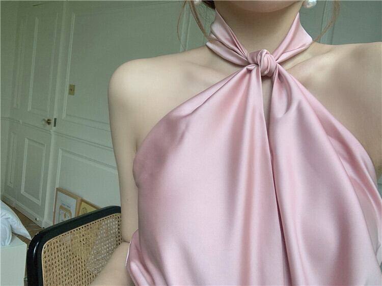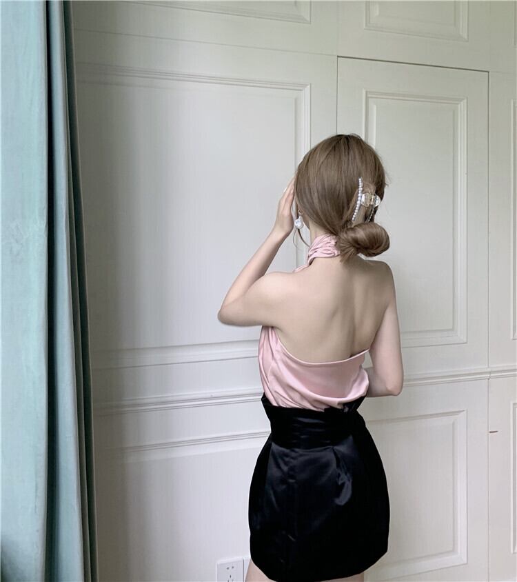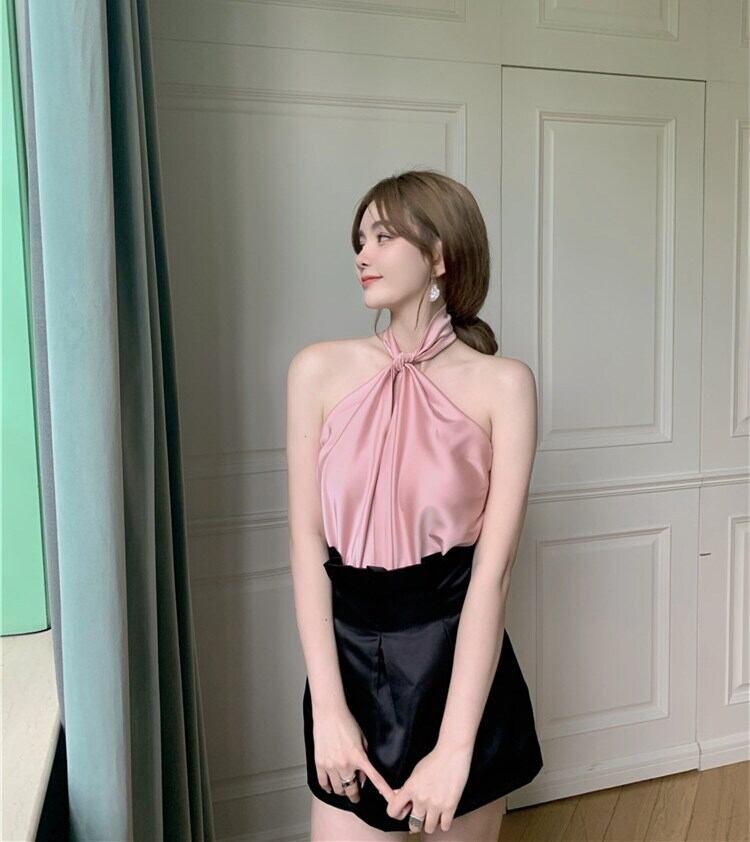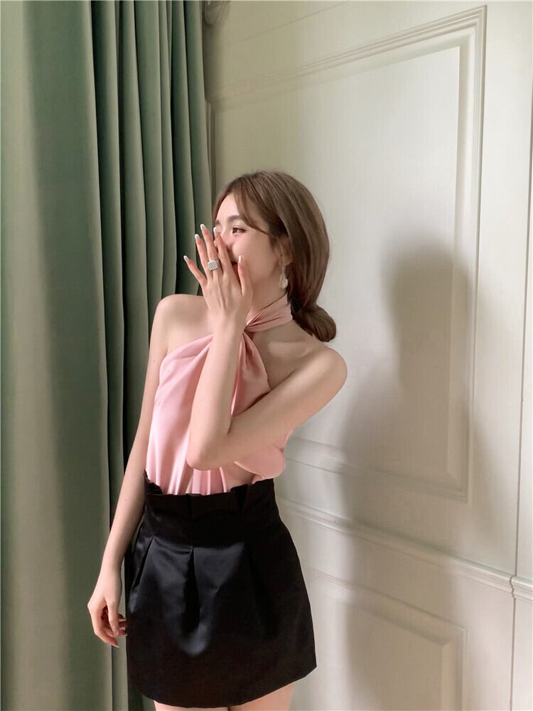 サマースタンダードホルタートップス ピンク レトロ 大人ガーリー スウィート キュート カジュアル 夏物 ピュア ブラックストロベリース83130564996