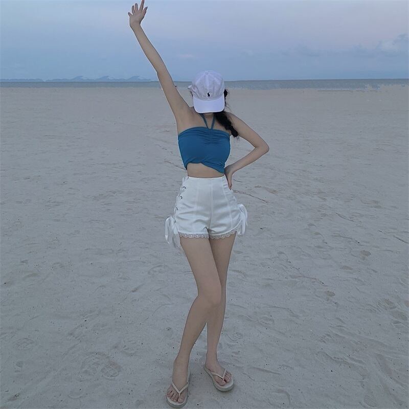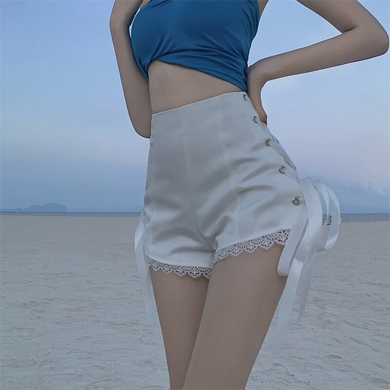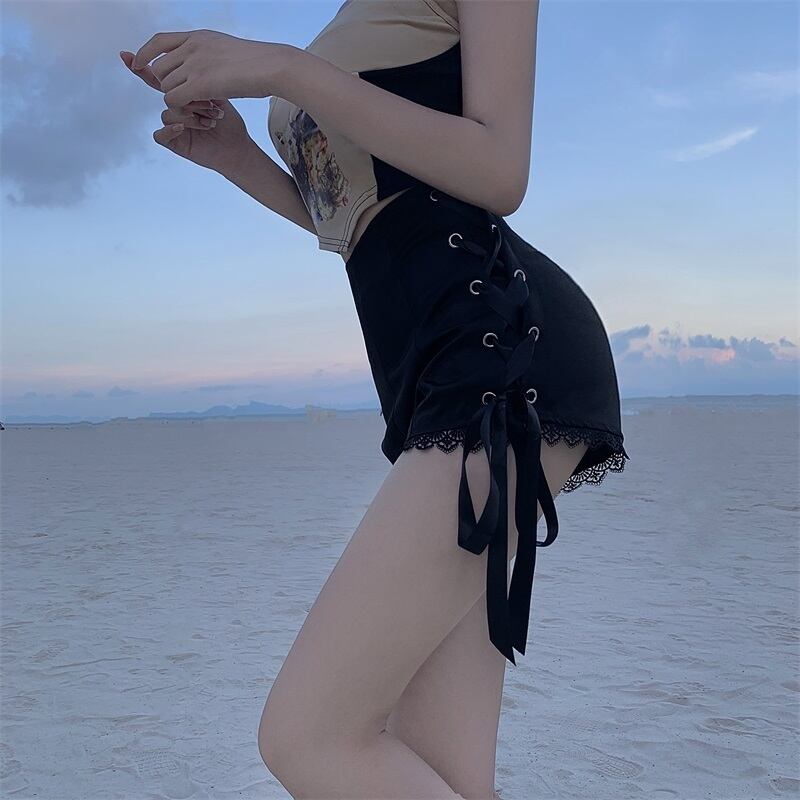 レースカジュアルパンツ ハイウェストウェスト薄手ブラックショーツ サマー 夏物 ブルマー ブラックストロベリース57729576869