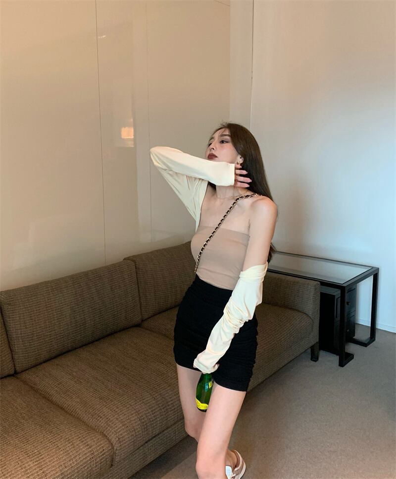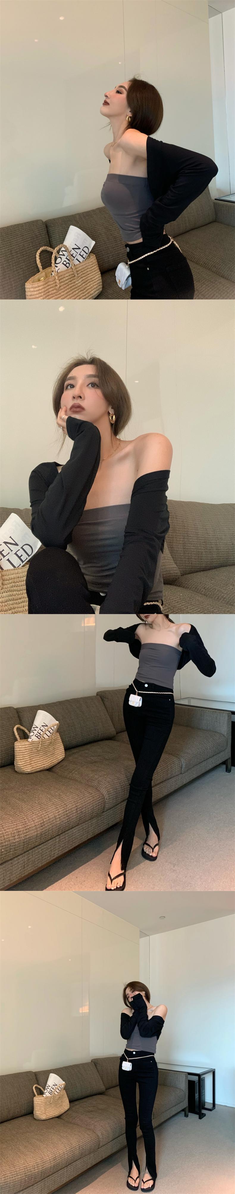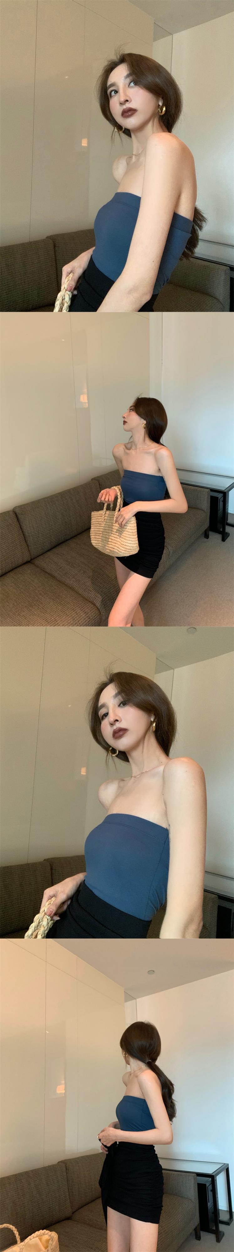 色:青いチューブトップ,黒いチューブトップ,グレーのチューブトップ,アプリコットチューブトップ,外は黒,アプリコット衣装,スプリットパンツ,スカート