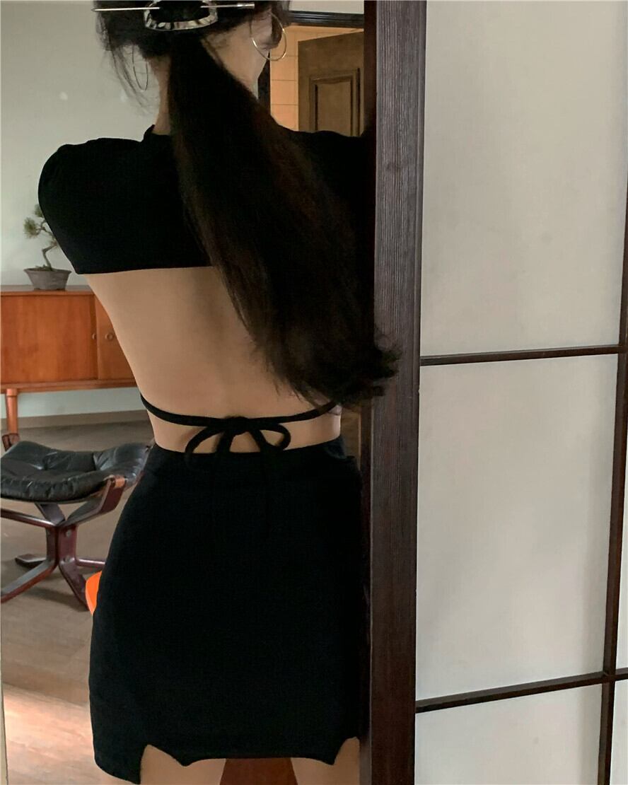 ニットTシャツ サマー薄手ショートホルターハイウェストウェストスリムブラックトップス 夏物 ブラックストロベリース99125516823