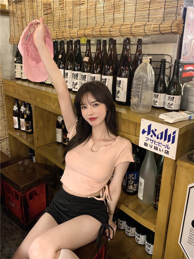 色:ピンクトップ,黒のショートパンツ
