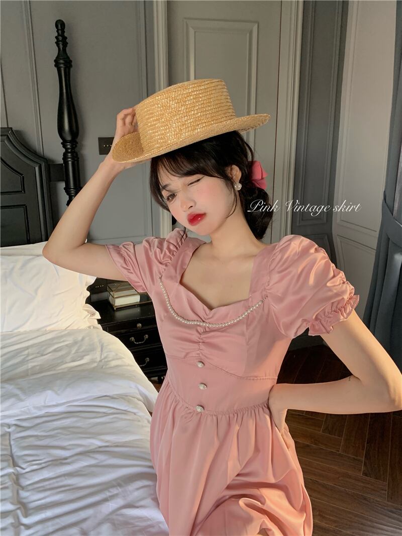 ドレス スリーブウェスト薄手半袖スカート サマー ショート ハーフスリーブ 夏物 スクウェア ブラックストロベリース50750154722