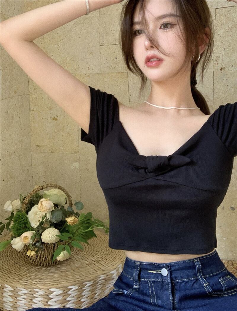 Tシャツ サマーショートVネックトップス 夏物 ブラックストロベリース18948032818