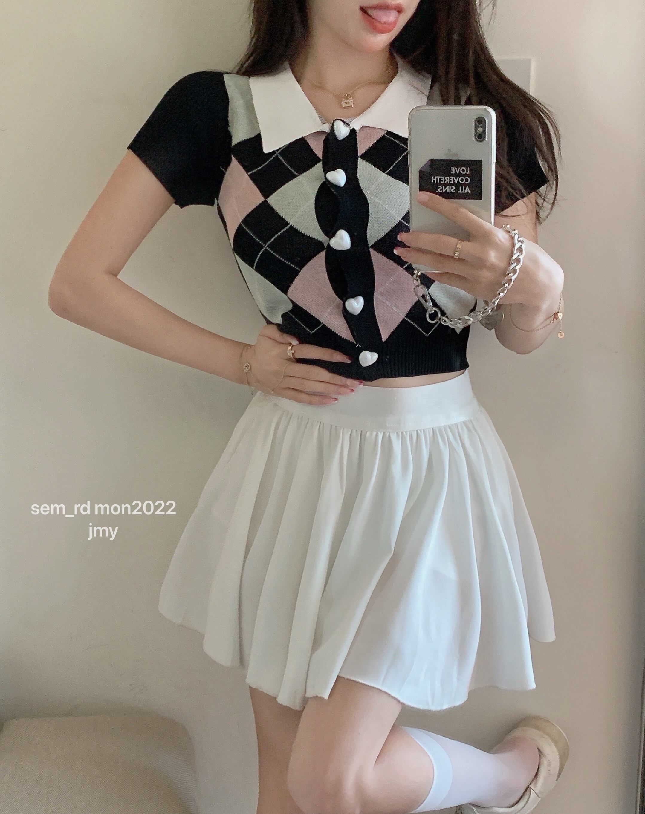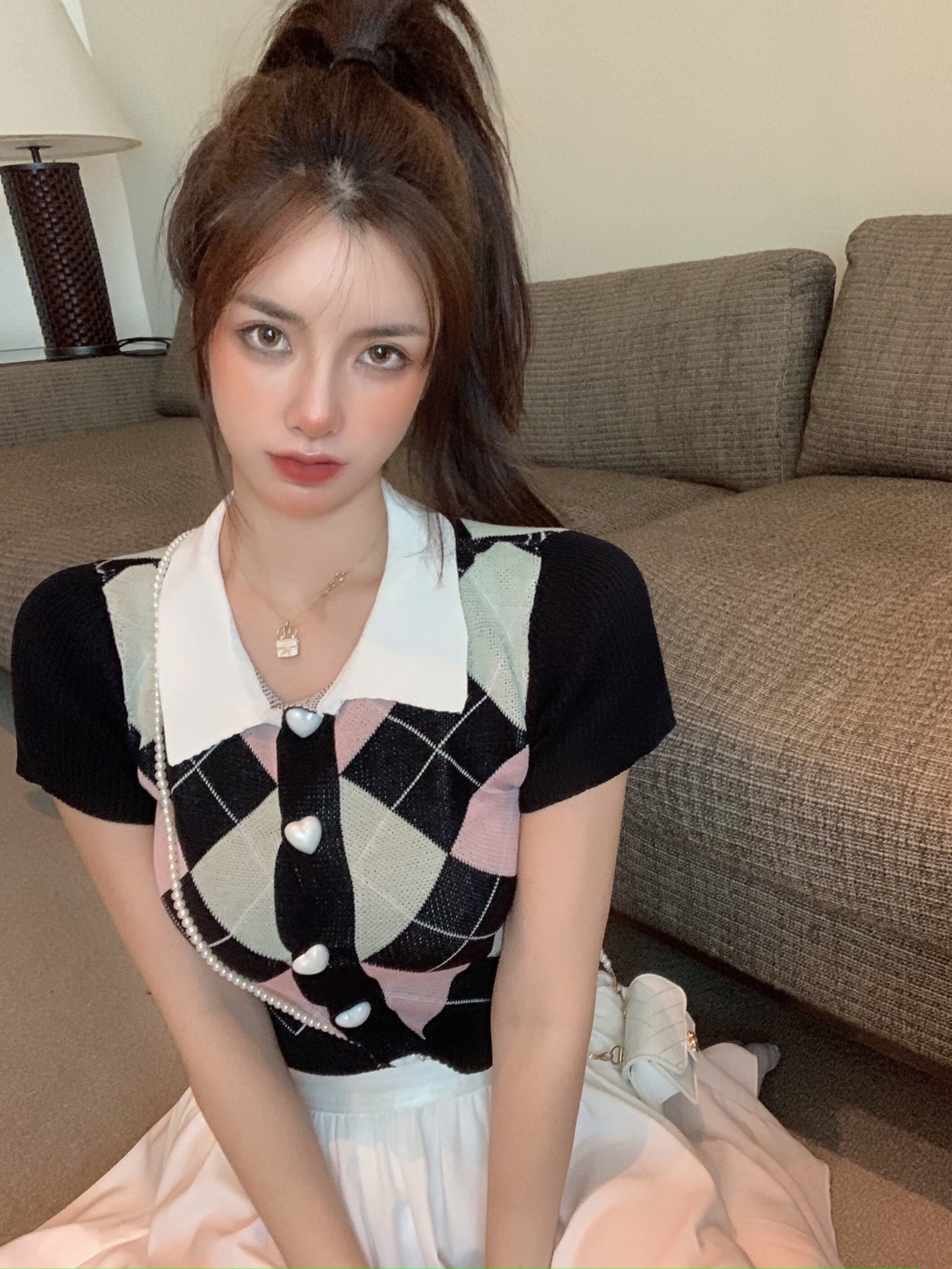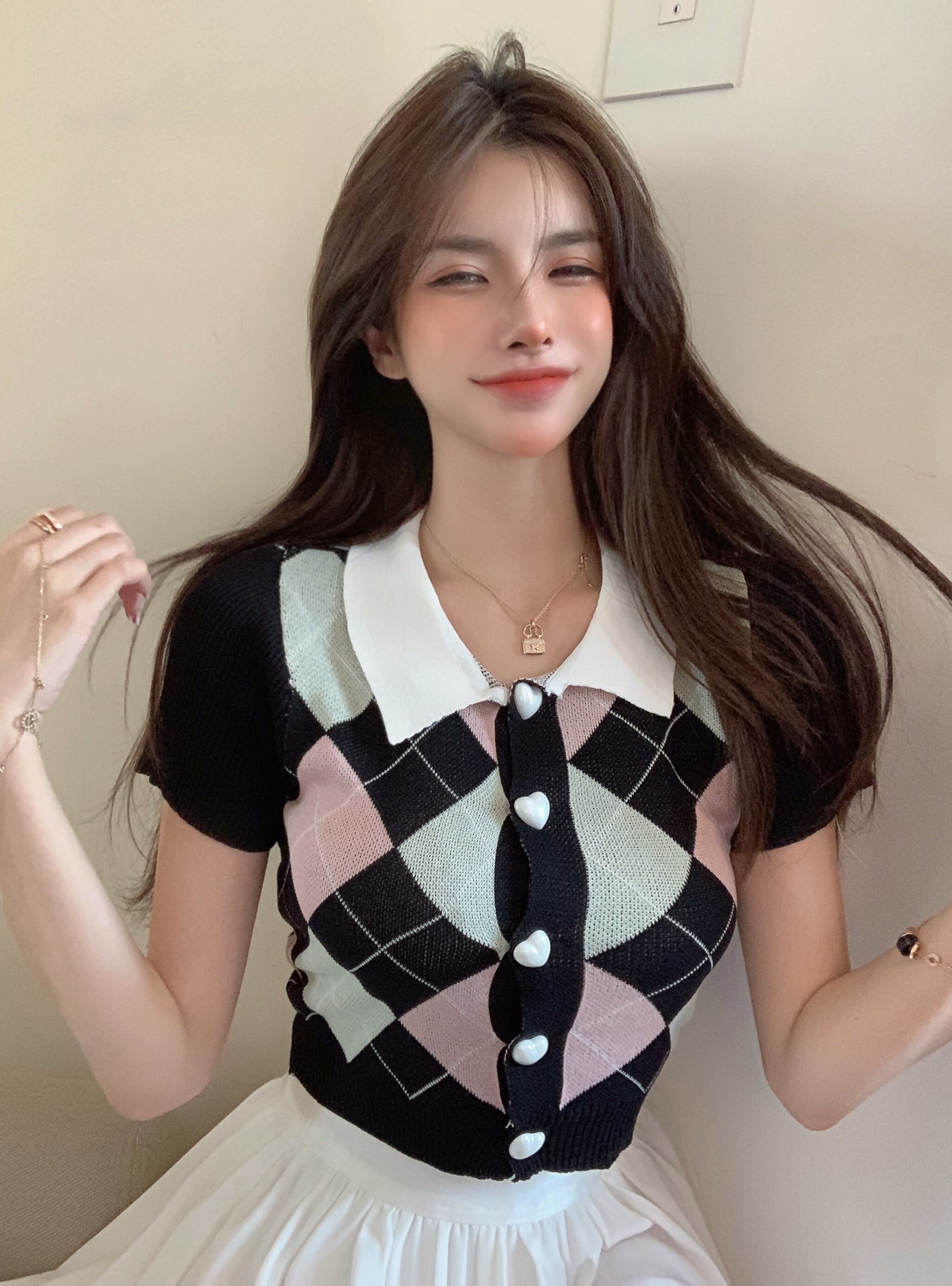 格子柄ニットカーディガンTシャツ サマー薄手半袖スリーブトップス ショート ハーフスリーブ 夏物 ヨーロピアン ブラックストロベリース14243682054