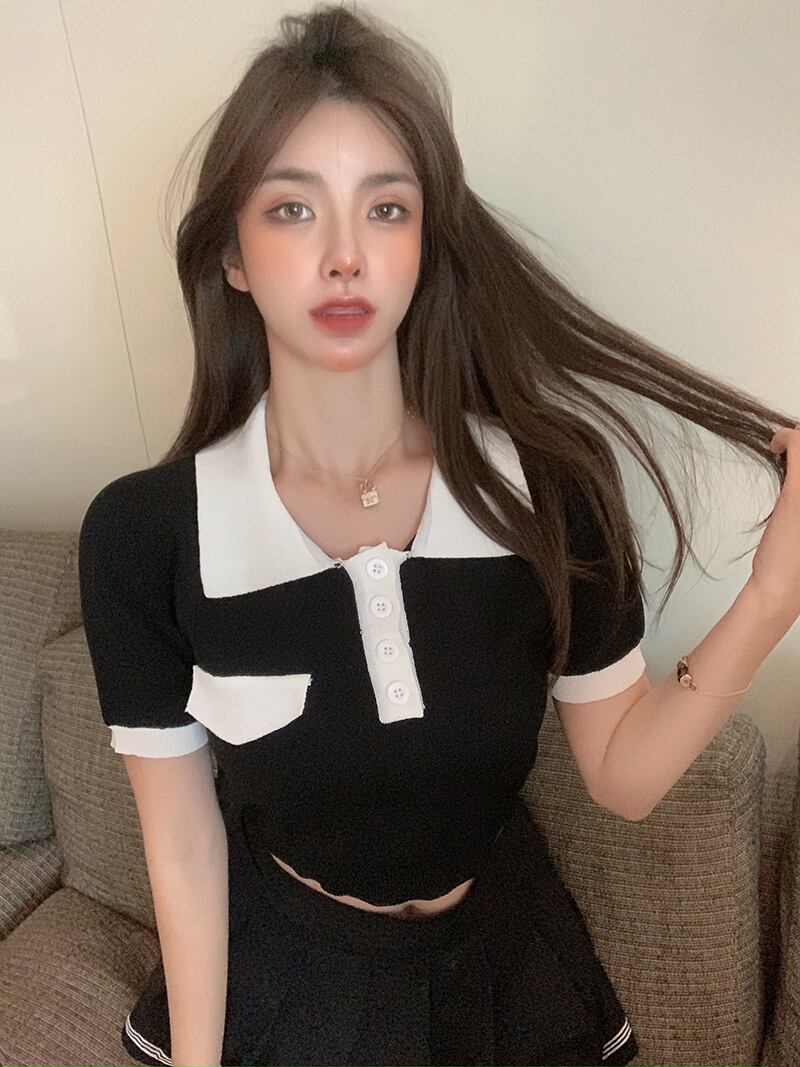 カラーセーター Tシャツ サマー薄手ショートトップス ピンク 大人ガーリー スウィート キュート カジュアル 夏物 ブラックストロベリース29900636103