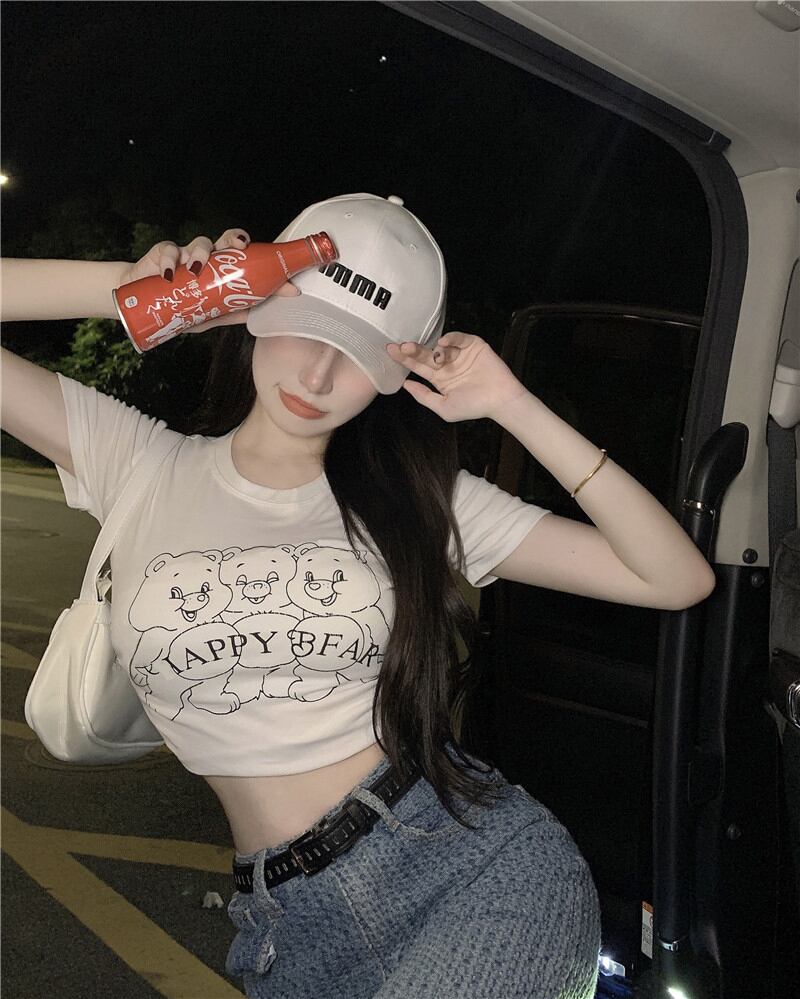 プリント柄Tシャツ サマーショートスリムブラック半袖スリーブトップス ハーフスリーブ 夏物 ブラックストロベリース68091079998
