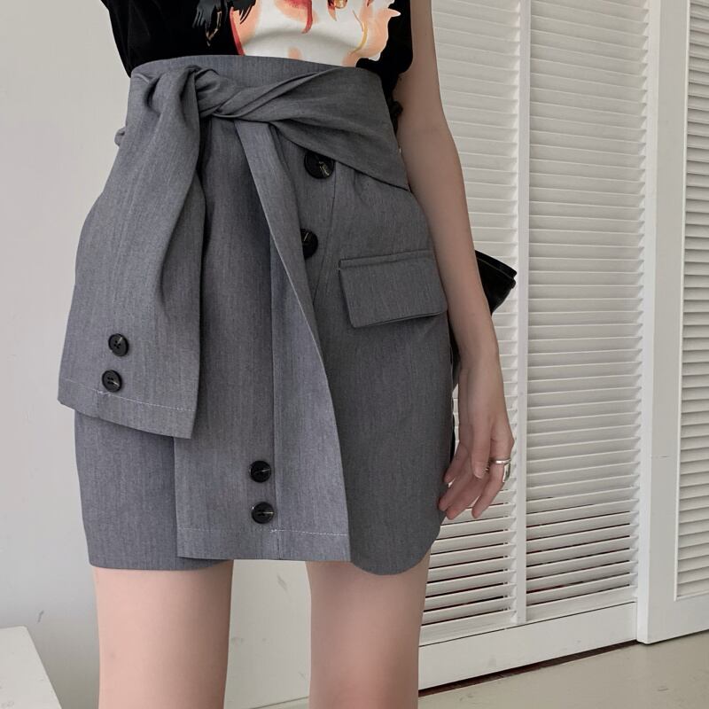 スカート サマーグレーショートハイウェストウェスト薄手Aライン 夏物 ブラックストロベリース39351788295