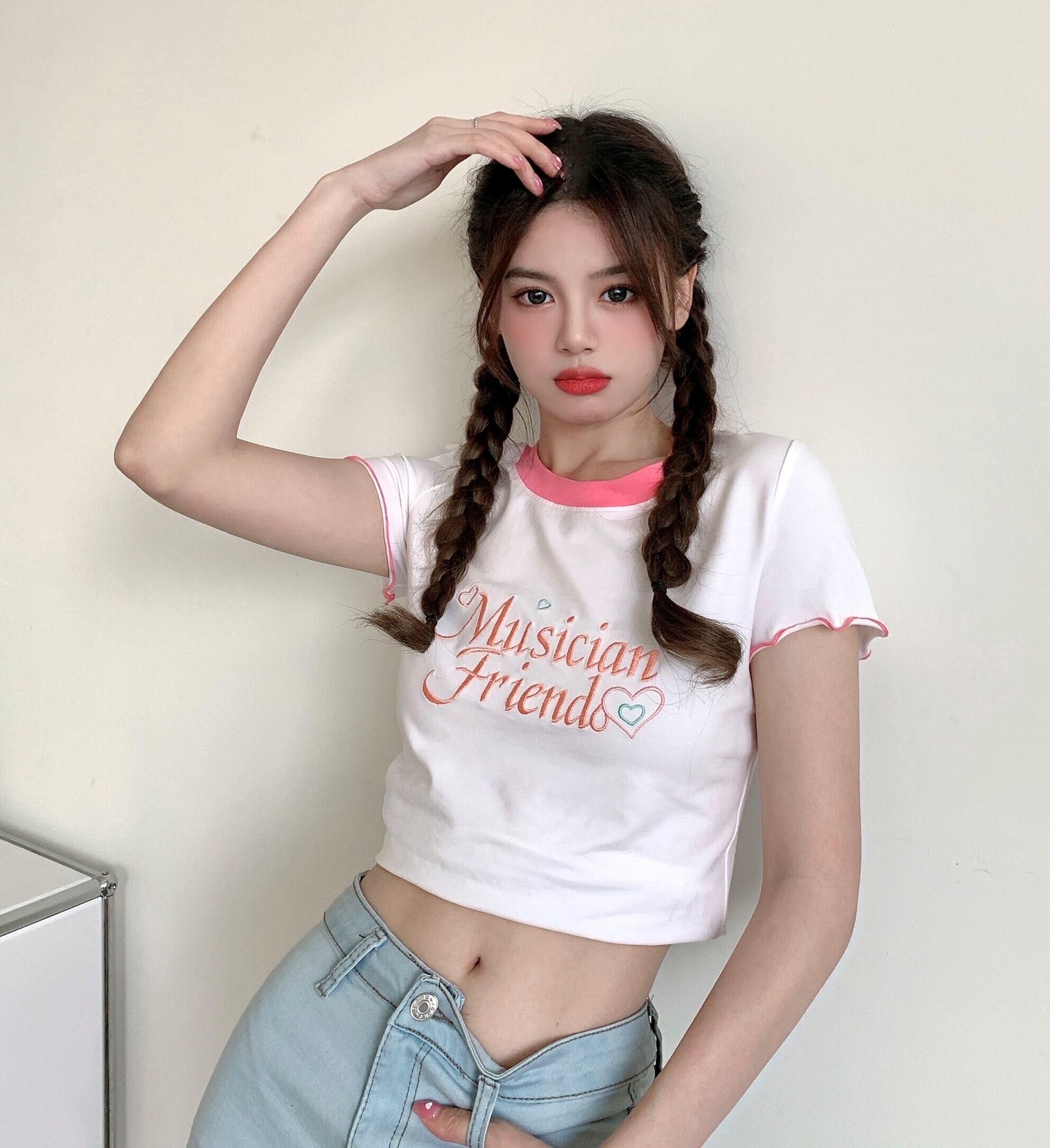 スリーブTシャツ サマーショートトップス ピンク 大人ガーリー スウィート キュート カジュアル 夏物 ピュア ブラックストロベリース57553781122