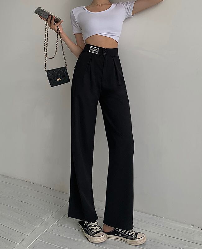 スタイルカジュアルパンツ レディースサマー薄手ブラックハイウェストウェストルーズワイドレッグ 夏物 ワイドパンツ ブラックストロベリース31646118650