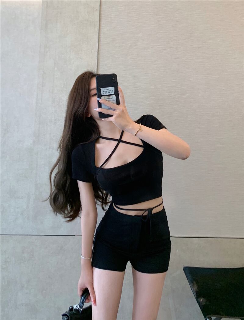 Tシャツ サマーストラップ ショートスリムブラックトップス 夏物 ブラックストロベリース50300835163