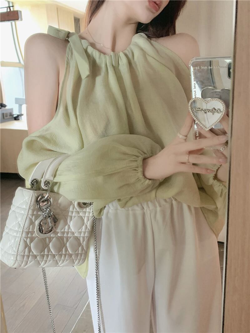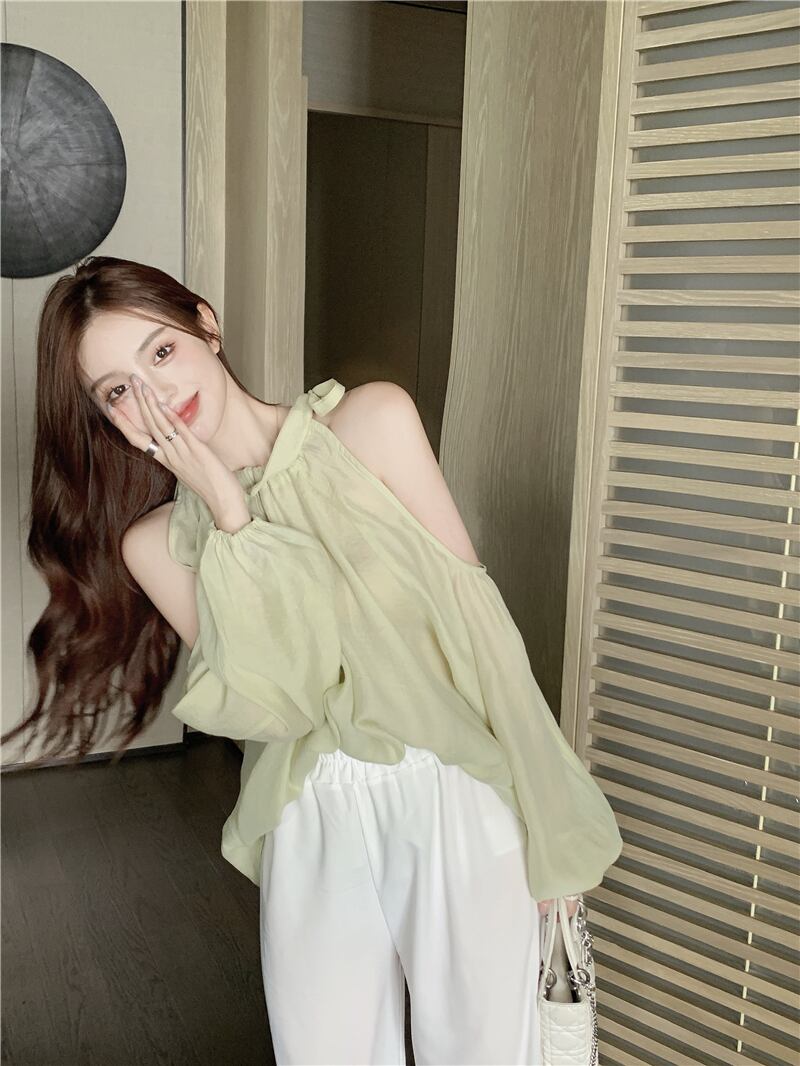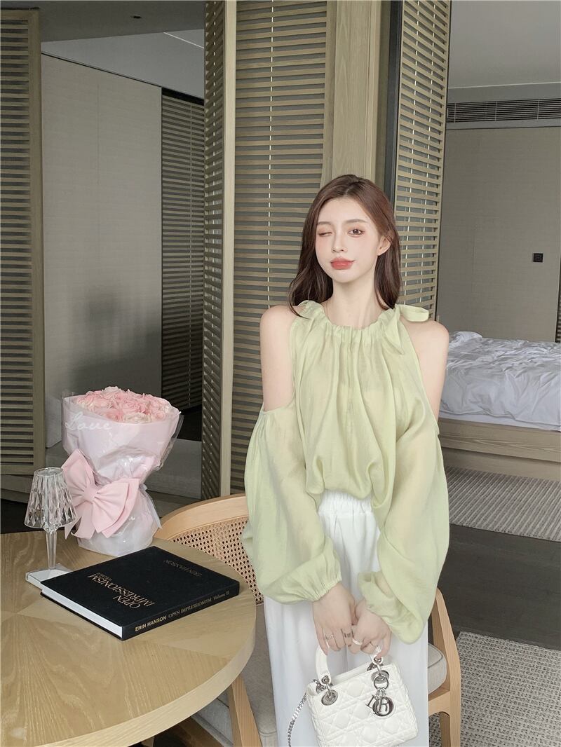 メッシュシャツ サマー薄手トップス ロング 夏物 オフショルダー ブラックストロベリース65448783710