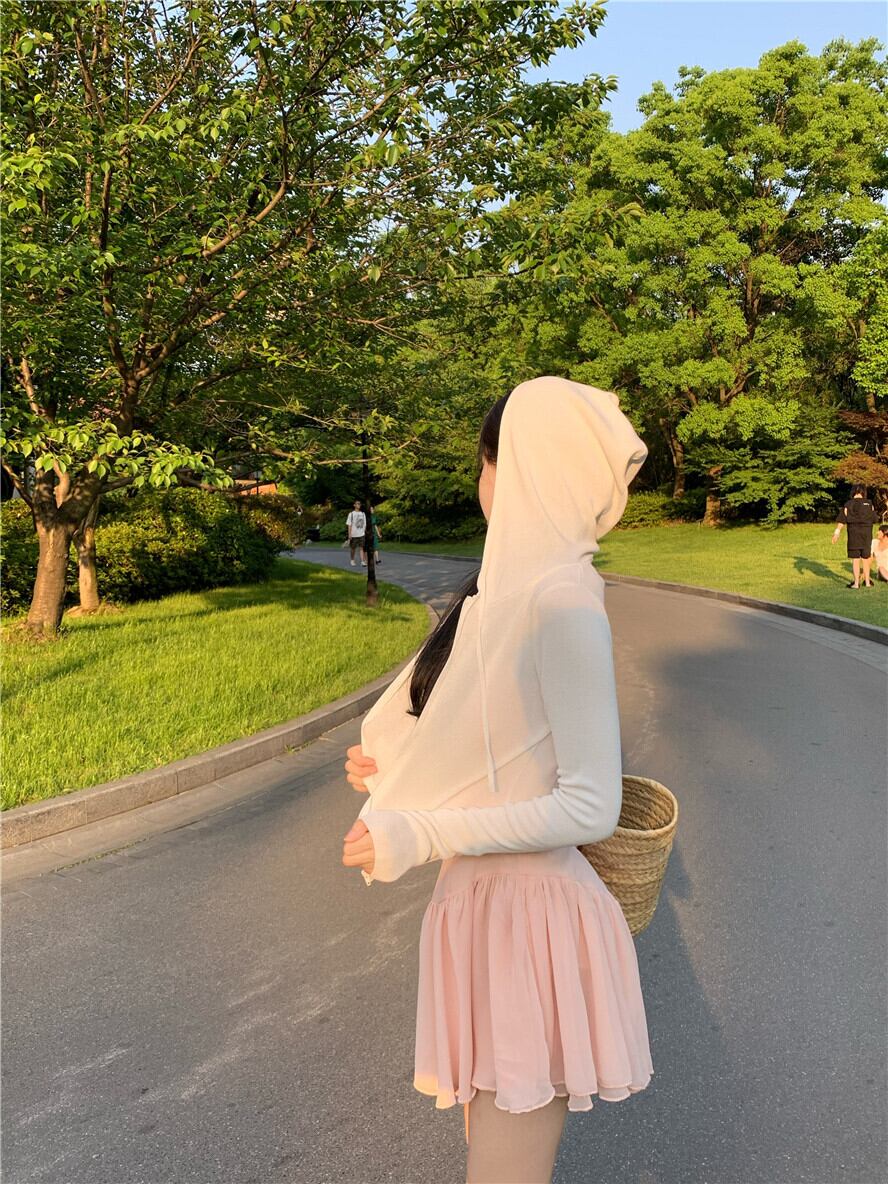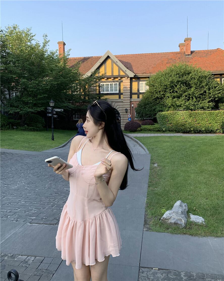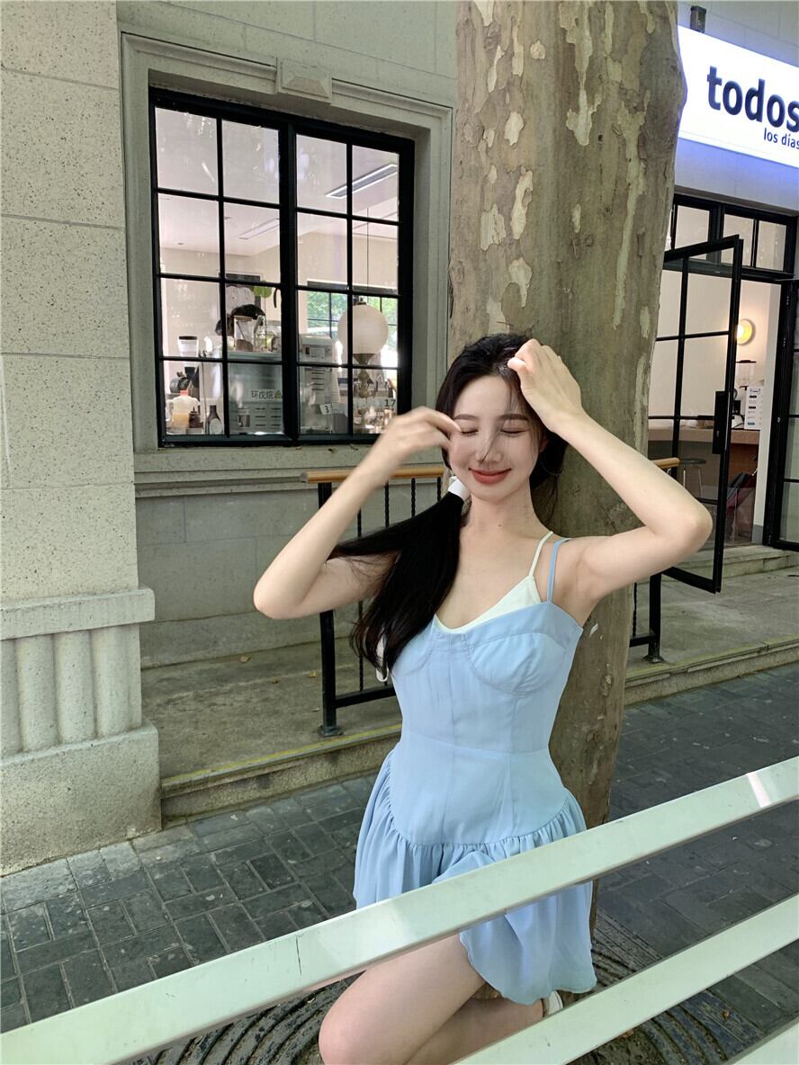 色:青い服,ピンクのドレス,美バックストラップ,ニットカーディガン