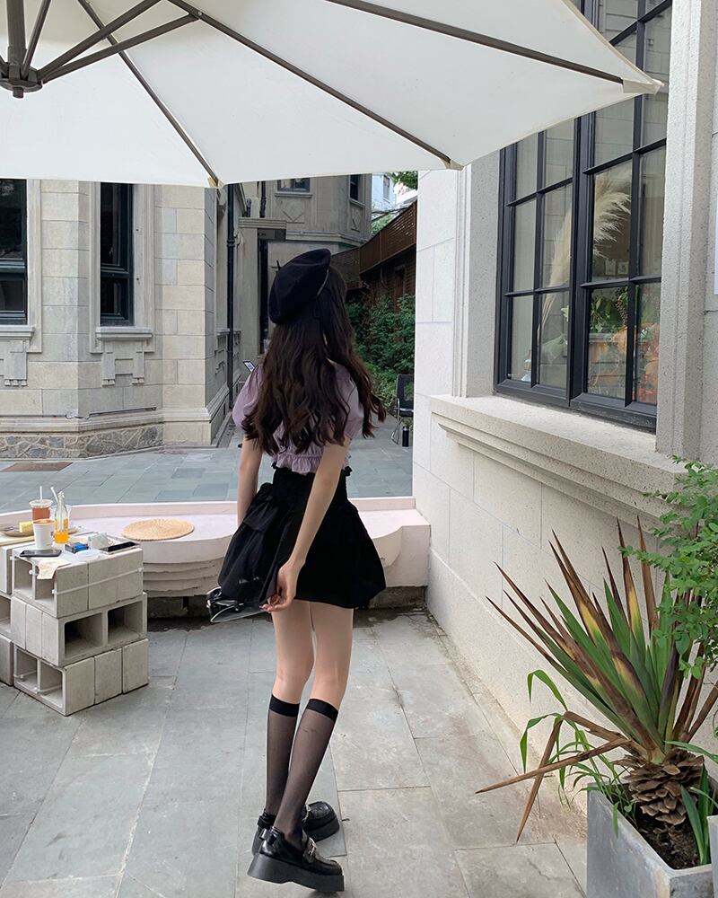 シフォンシャツ リボンサマートップス 夏物 パープル ブラックストロベリース87054611549