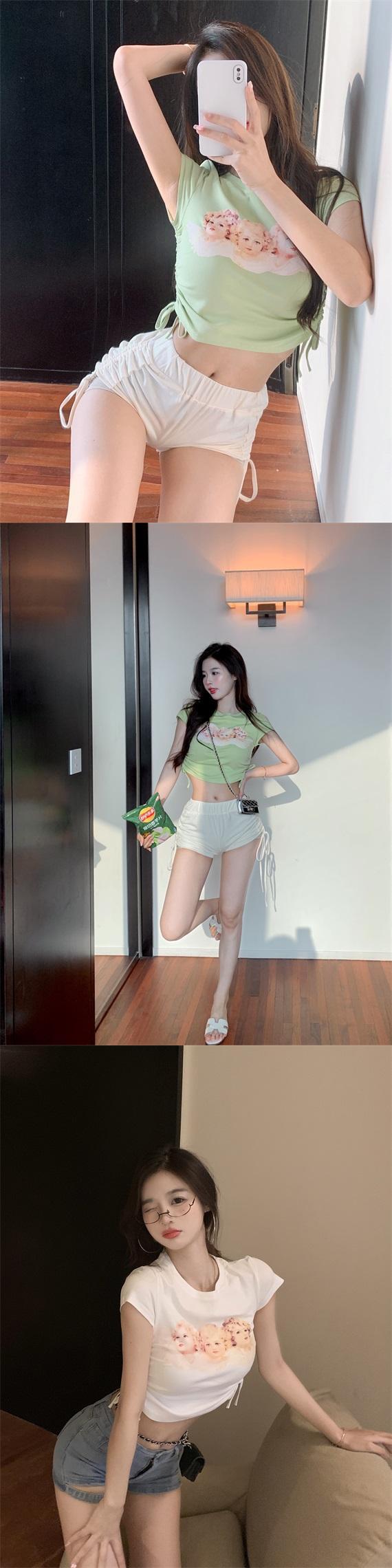 Tシャツ サマーグリーンショートクロップドプリント柄ギャザープリーツトップス 大人ガーリー スウィート キュート カジュアル 夏物 ピュア ブラックストロベリース59997708565